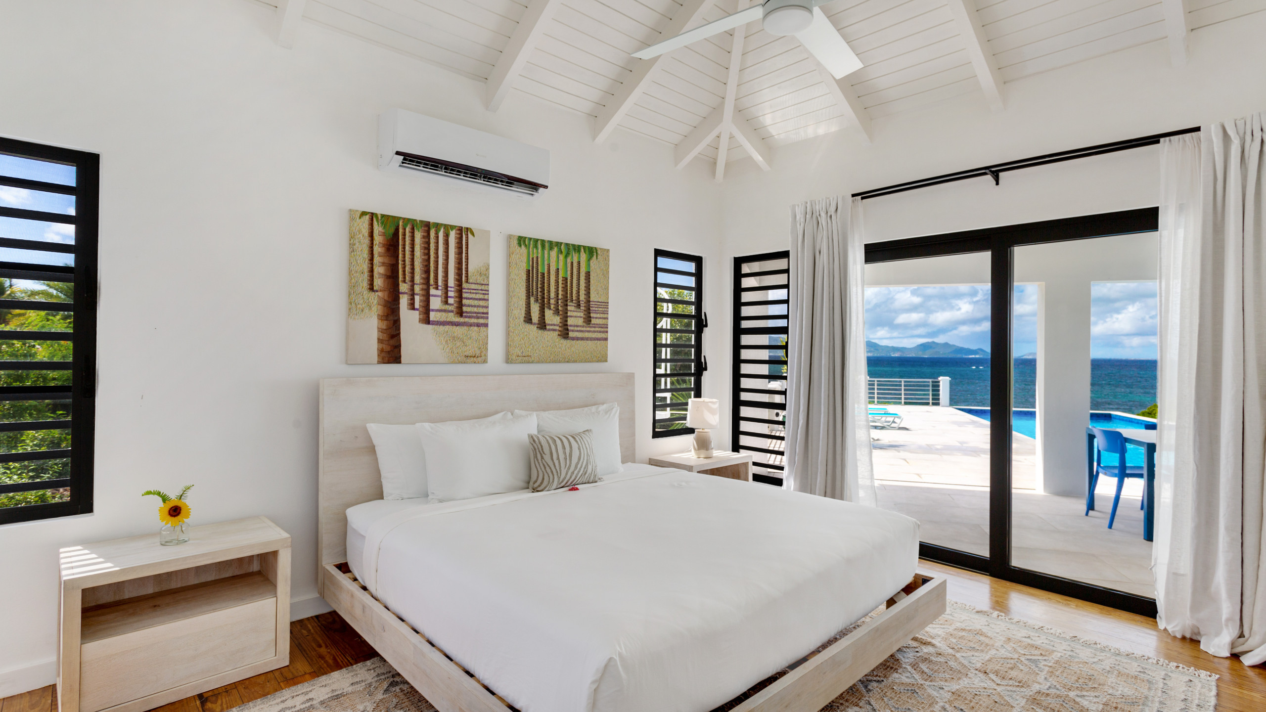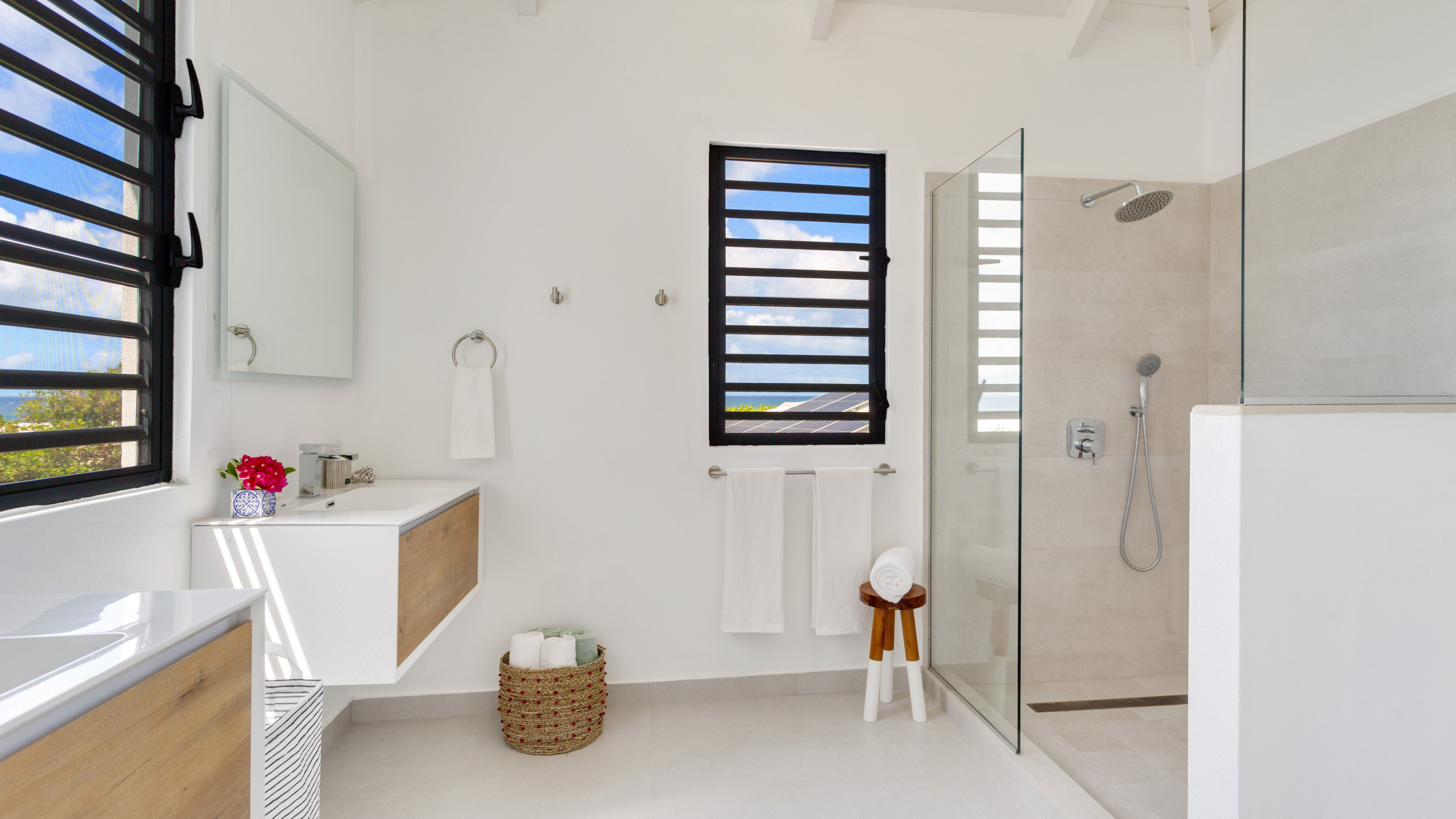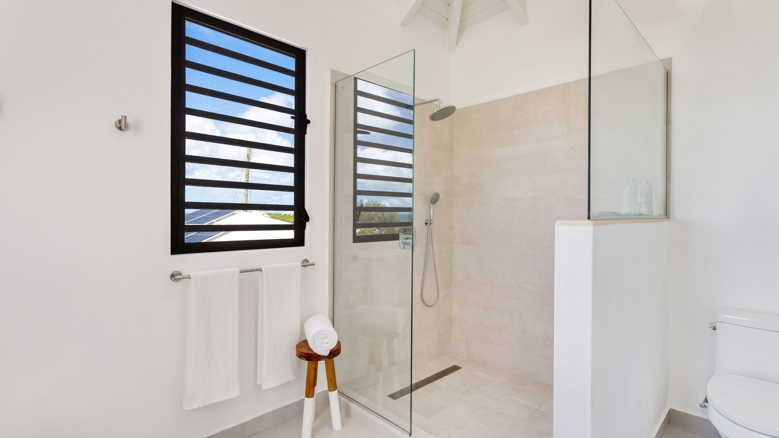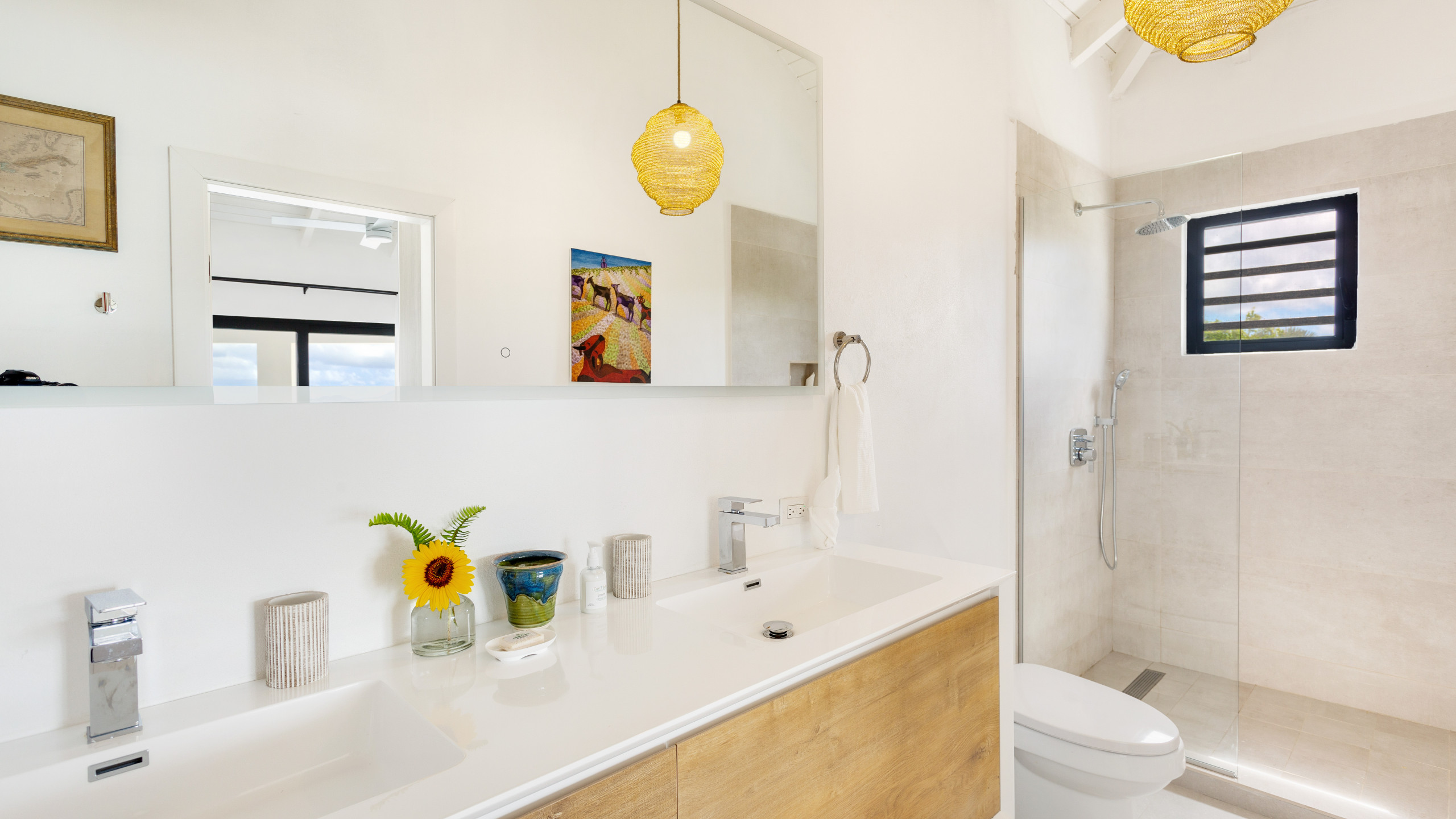 Both bedrooms are thoughtfully designed with comfort and elegance in mind. Each features a king-sized bed, a luxurious en-suite bathroom with a walk-in shower and double vanity, air conditioning, ceiling fans, and modern amenities including TVs and bedside charging ports. Step directly onto the furnished terrace from either bedroom to enjoy the infinity-edge pool and breathtaking Caribbean vistas.