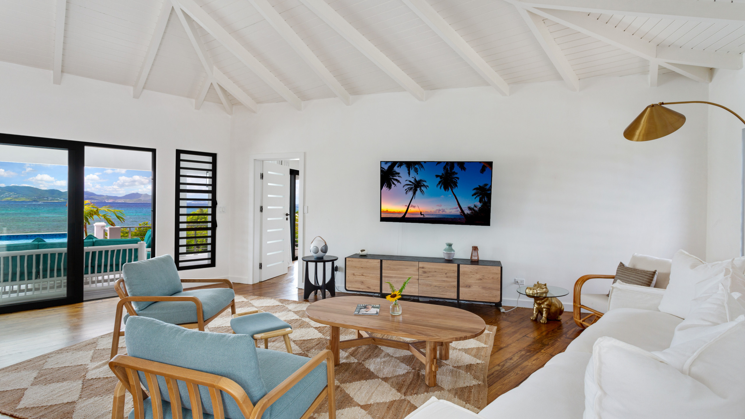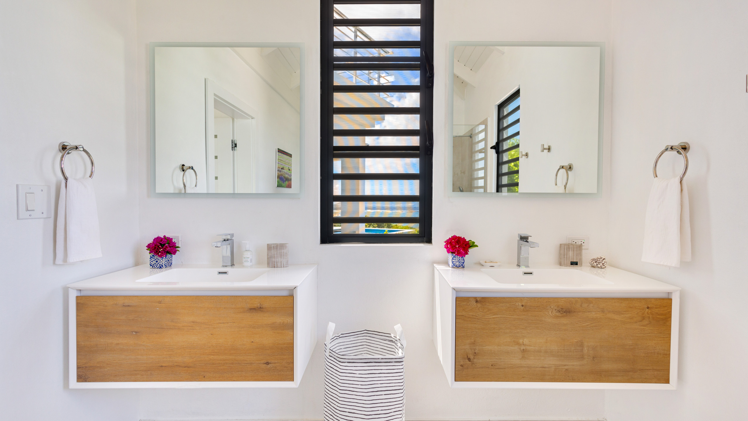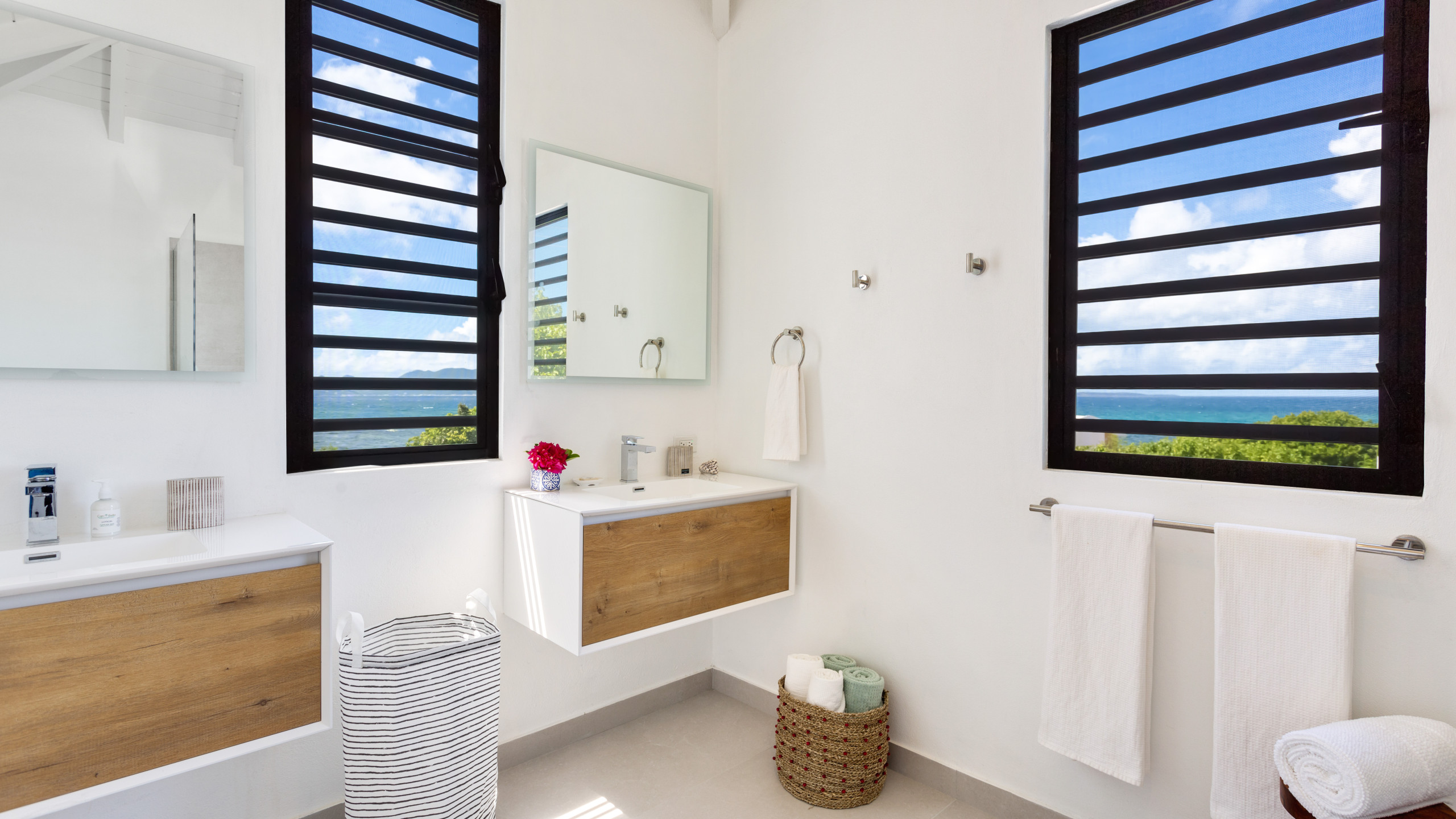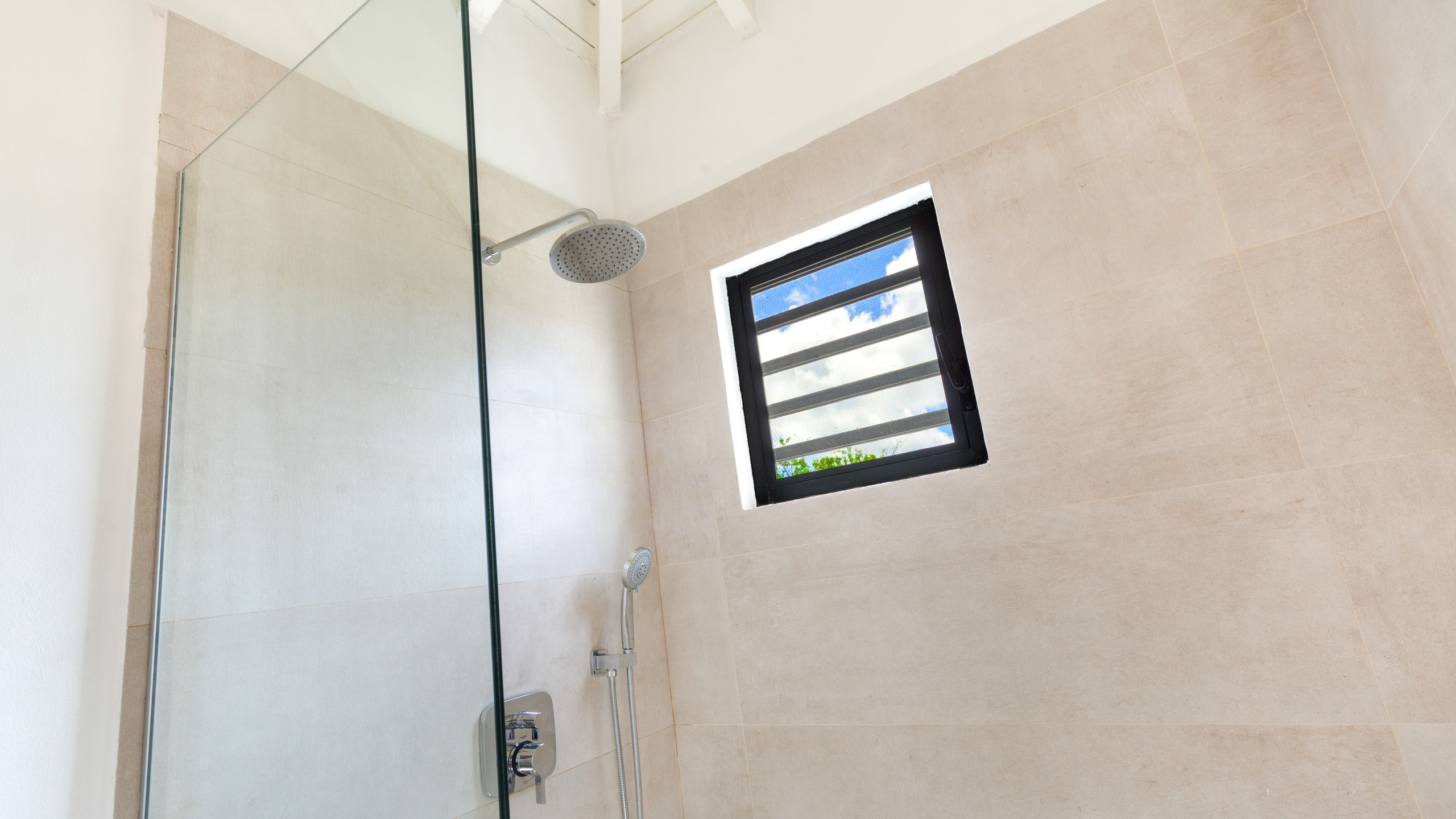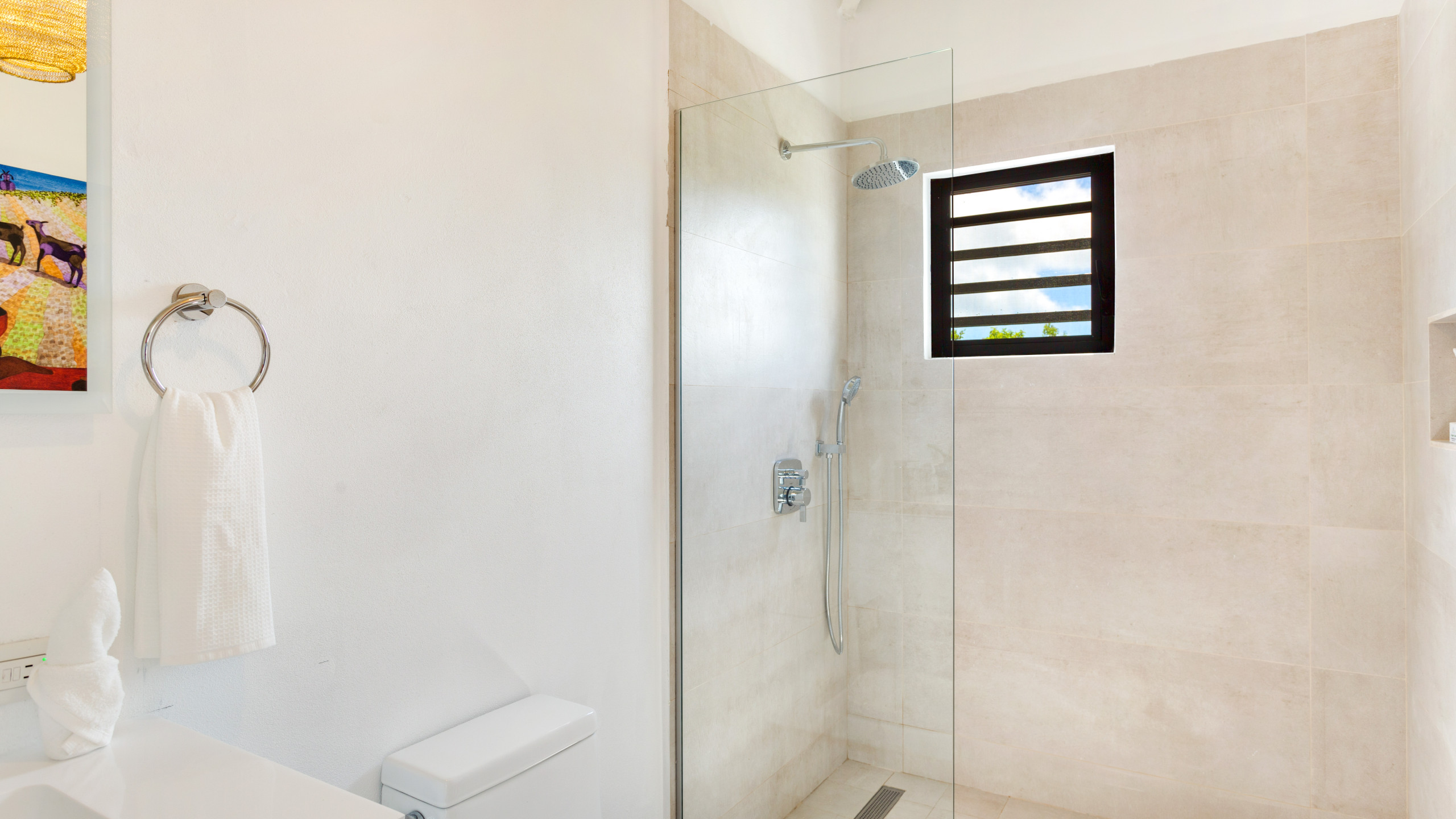 Both bedrooms are thoughtfully designed with comfort and elegance in mind. Each features a king-sized bed, a luxurious en-suite bathroom with a walk-in shower and double vanity, air conditioning, ceiling fans, and modern amenities including TVs and bedside charging ports. Step directly onto the furnished terrace from either bedroom to enjoy the infinity-edge pool and breathtaking Caribbean vistas.