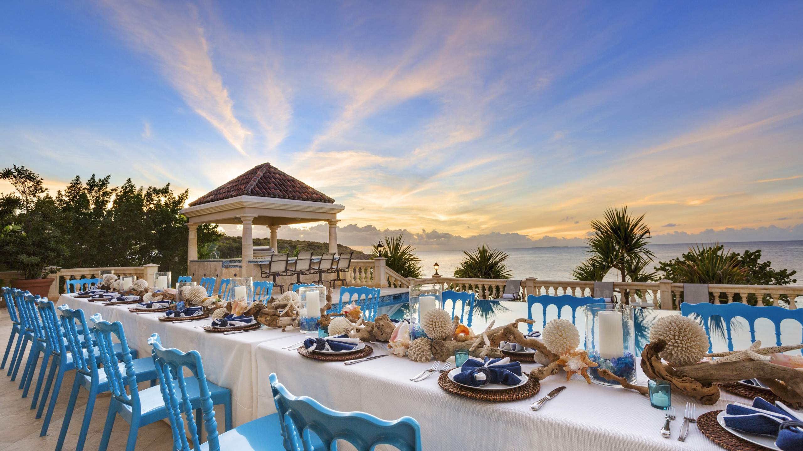 Optional services include, chef, butler, childcare, massage, excursions, car rentals, air and boat transfers, grocery shopping, celebration décor, florals, music/entertainment, restaurant reservations, tee times, and more. We can provide options and pricing.