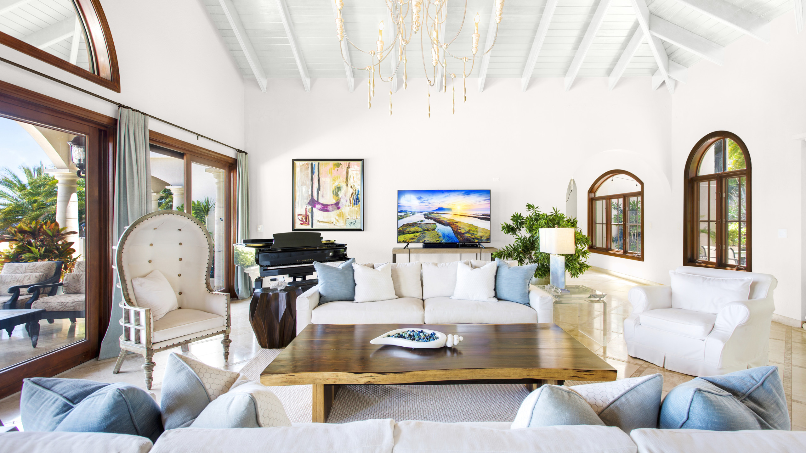Sandcastle Villa comfortably accommodates up to 10 adults and 2 children, with additional arrangements available for larger groups. The Master Suite is a haven of luxury, featuring a private balcony with awe-inspiring ocean vistas, Kreiss furnishings, a Tempur- Pedic mattress, and a romantic en-suite bathroom with a deep soaking tub and outdoor shower. The Junior Master mirrors this elegance, with a private balcony and spectacular views. For families, a newly added double king bed suite and a charming ‘Kids Lounge’ provide dedicated space for play and relaxation, equipped with an Xbox, Apple TV, a bookshelf, and a computer desk, plus twin beds for two young children.