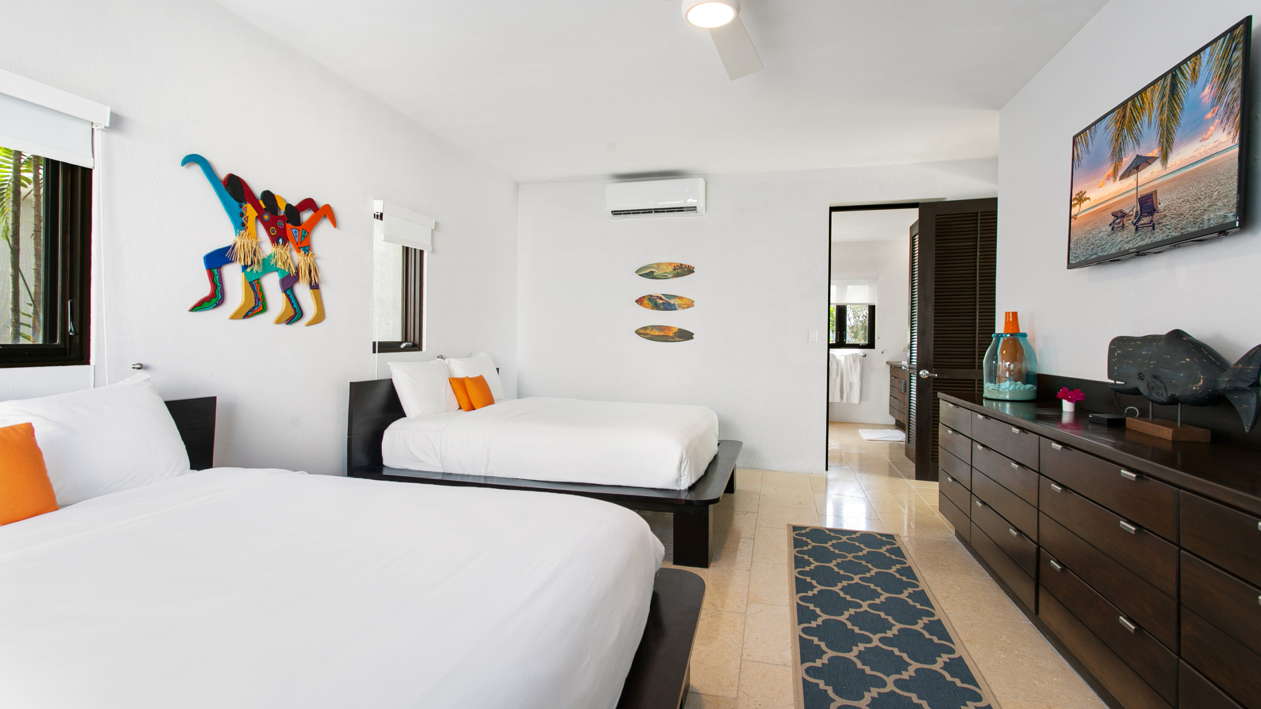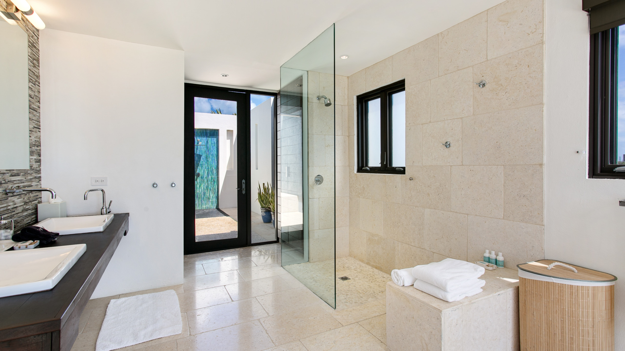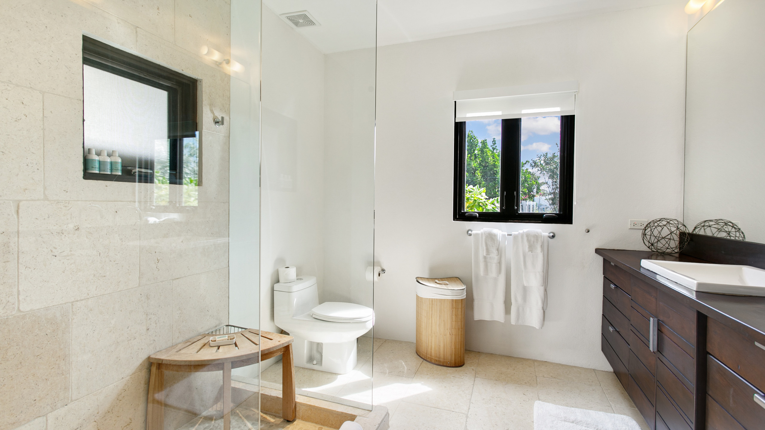 The villa’s interiors combine modern elegance with island charm, featuring rich woods, stone, and concrete to create a serene yet contemporary atmosphere. Indoor and outdoor living spaces flow seamlessly, including two outdoor showers, a gas grill for al fresco dining, a home entertainment system, and Wi-Fi. The upper level houses two master suites, each with en-suite bathrooms, freestanding tubs, indoor and outdoor showers, double vanities, private terraces, AC, ceiling fans, and televisions. On the lower level, two additional bedrooms with en-suite bathrooms provide flexible configurations, outdoor access, and connecting doors, making the villa ideal for families or groups.