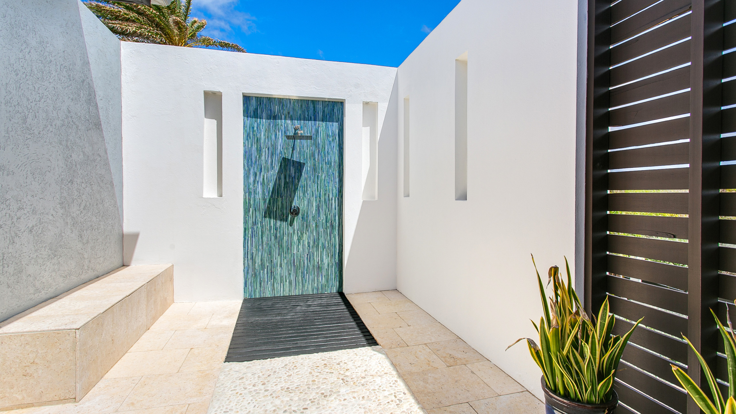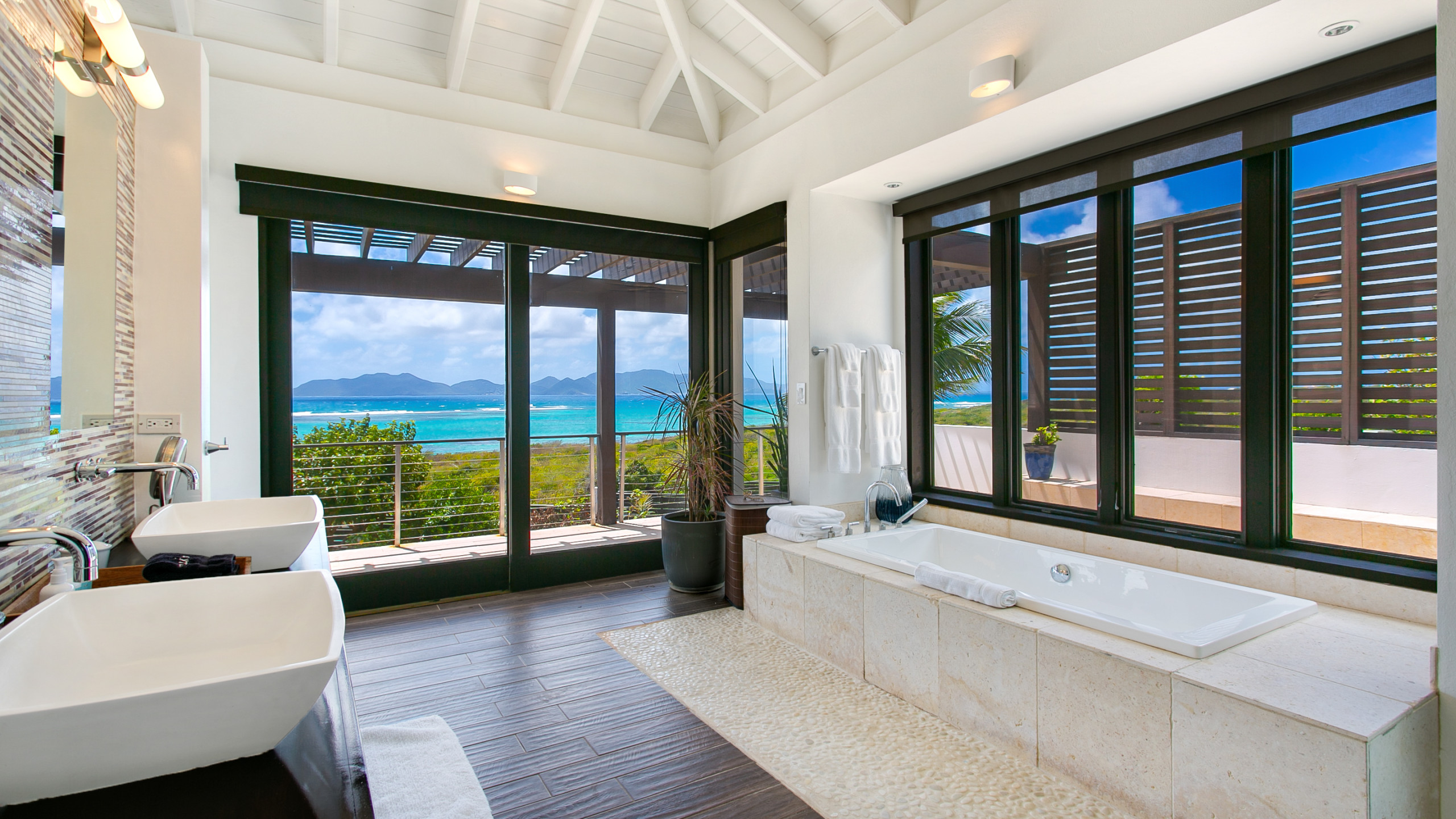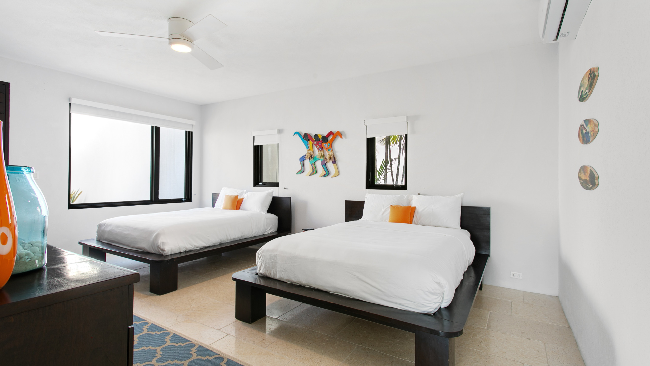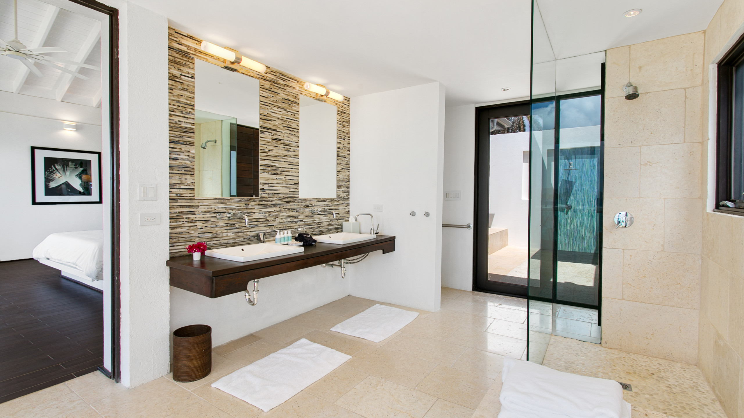 The villa’s interiors combine modern elegance with island charm, featuring rich woods, stone, and concrete to create a serene yet contemporary atmosphere. Indoor and outdoor living spaces flow seamlessly, including two outdoor showers, a gas grill for al fresco dining, a home entertainment system, and Wi-Fi. The upper level houses two master suites, each with en-suite bathrooms, freestanding tubs, indoor and outdoor showers, double vanities, private terraces, AC, ceiling fans, and televisions. On the lower level, two additional bedrooms with en-suite bathrooms provide flexible configurations, outdoor access, and connecting doors, making the villa ideal for families or groups.