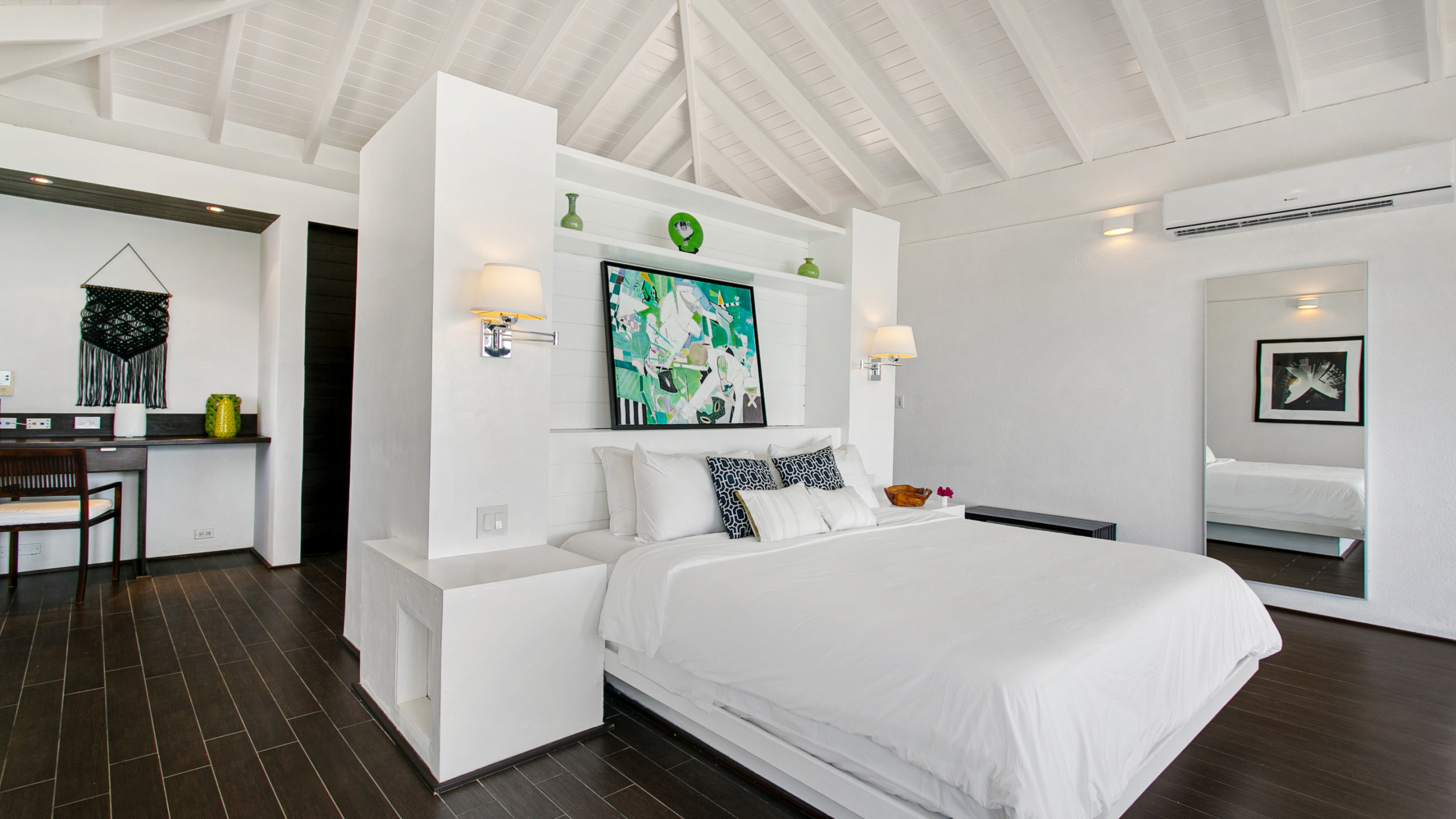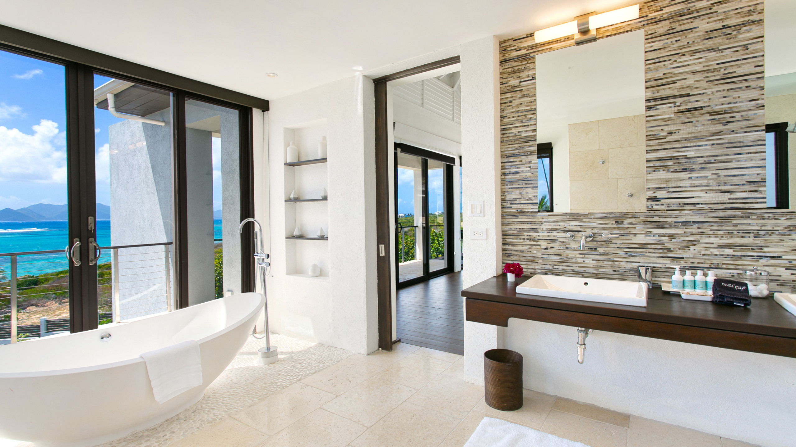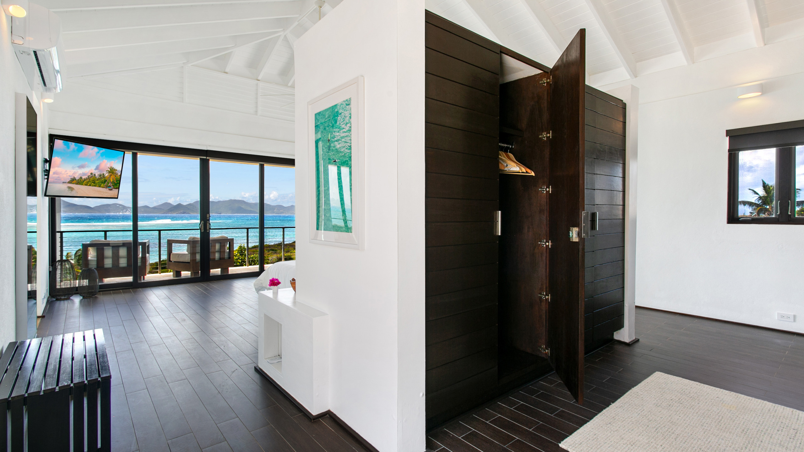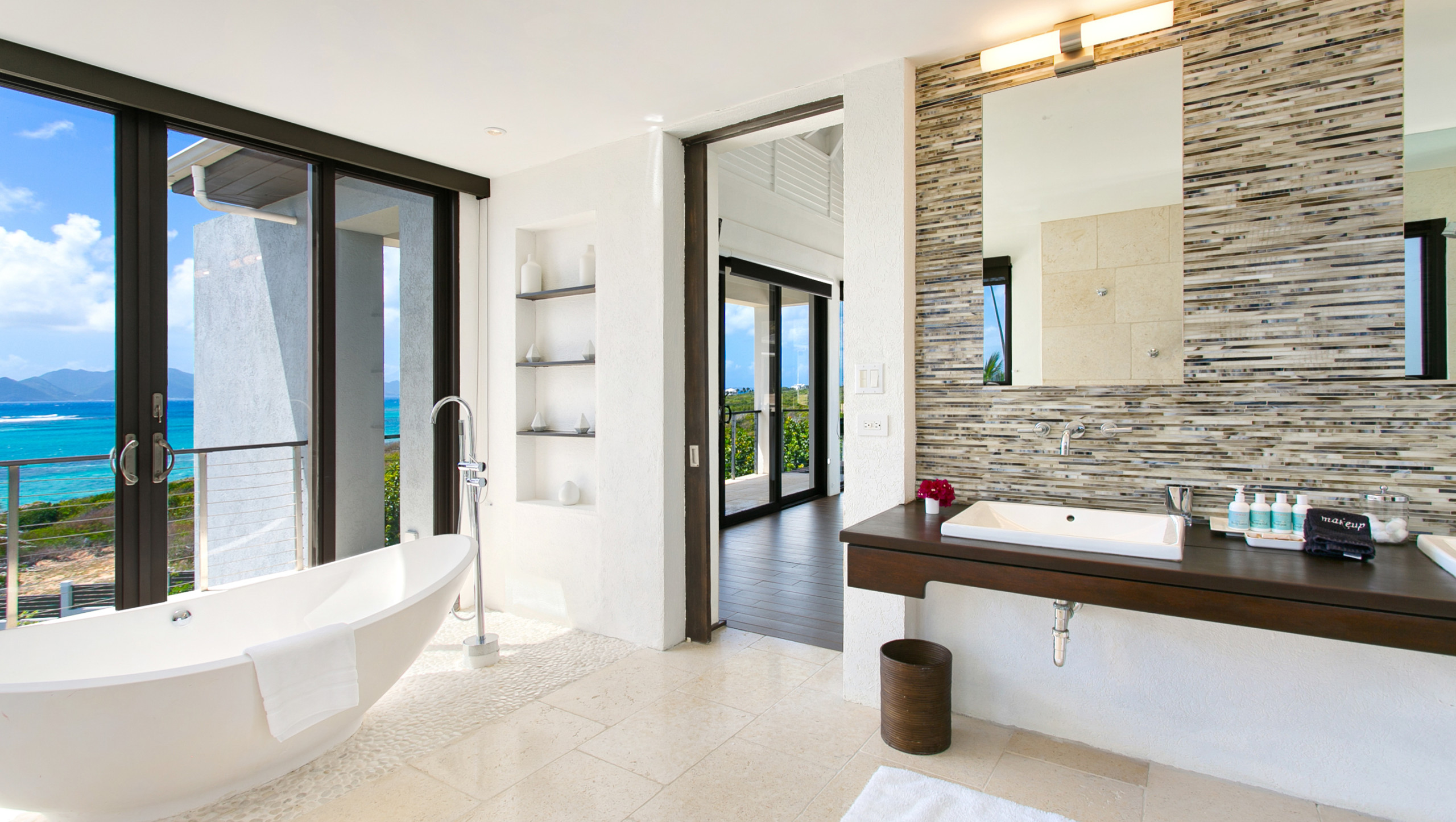 A private path leads to a secluded beach area with loungers and sofas, while the villa’s pool area and spacious terrace, complete with a covered dining space, provide an ideal setting for relaxation and entertaining. Each bedroom includes an en-suite bathroom, AC, flat-screen TV, and terrace access. The upper-level features two master suites with king-sized beds, freestanding tubs, indoor and outdoor showers, double vanities, seating areas, and furnished terraces with ocean views. The lower level houses a third master suite with a king bed and en-suite bath, as well as a fourth bedroom with two double beds and shared terrace access. Villa Anani also offers a fully equipped kitchen, media room, daily housekeeping.