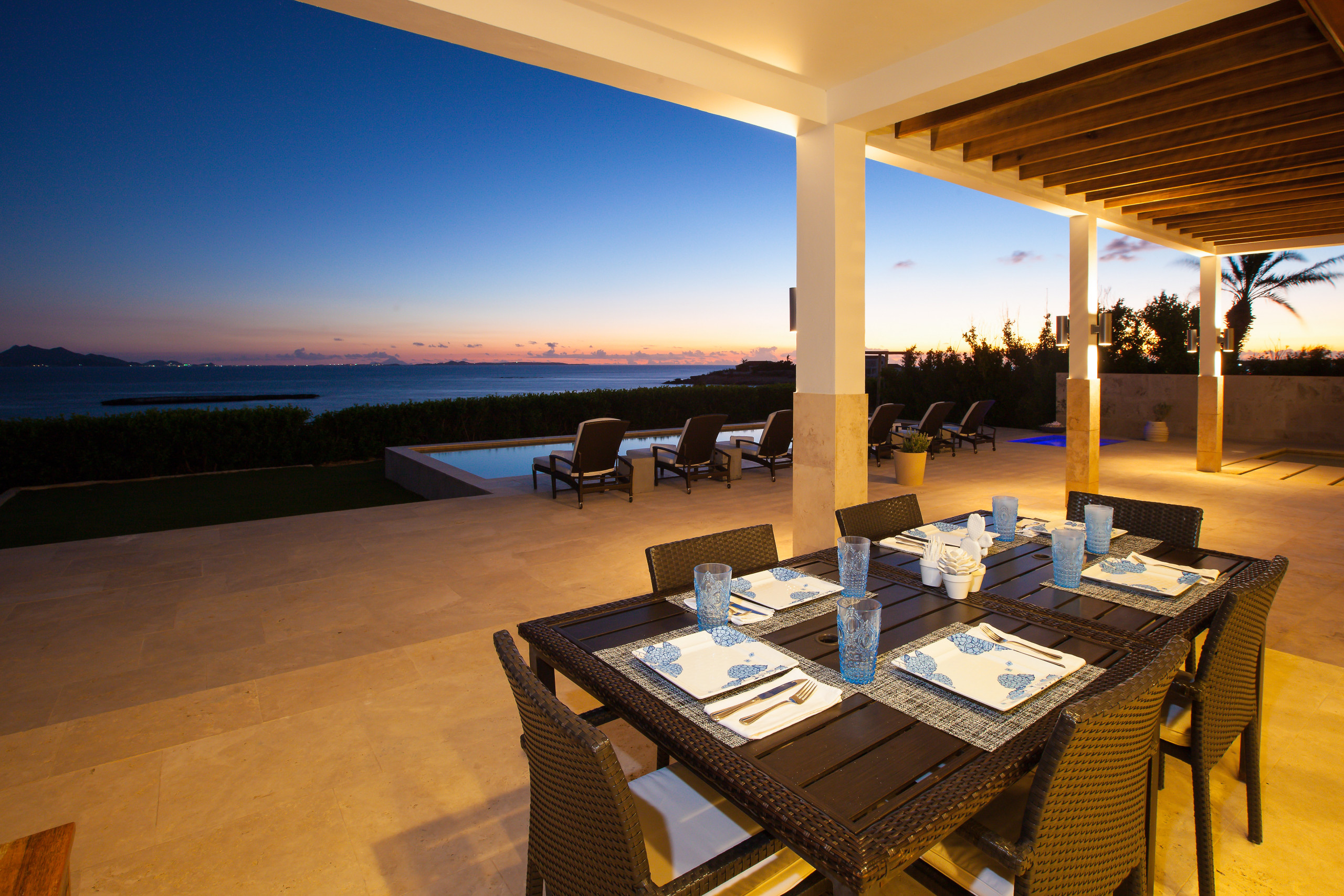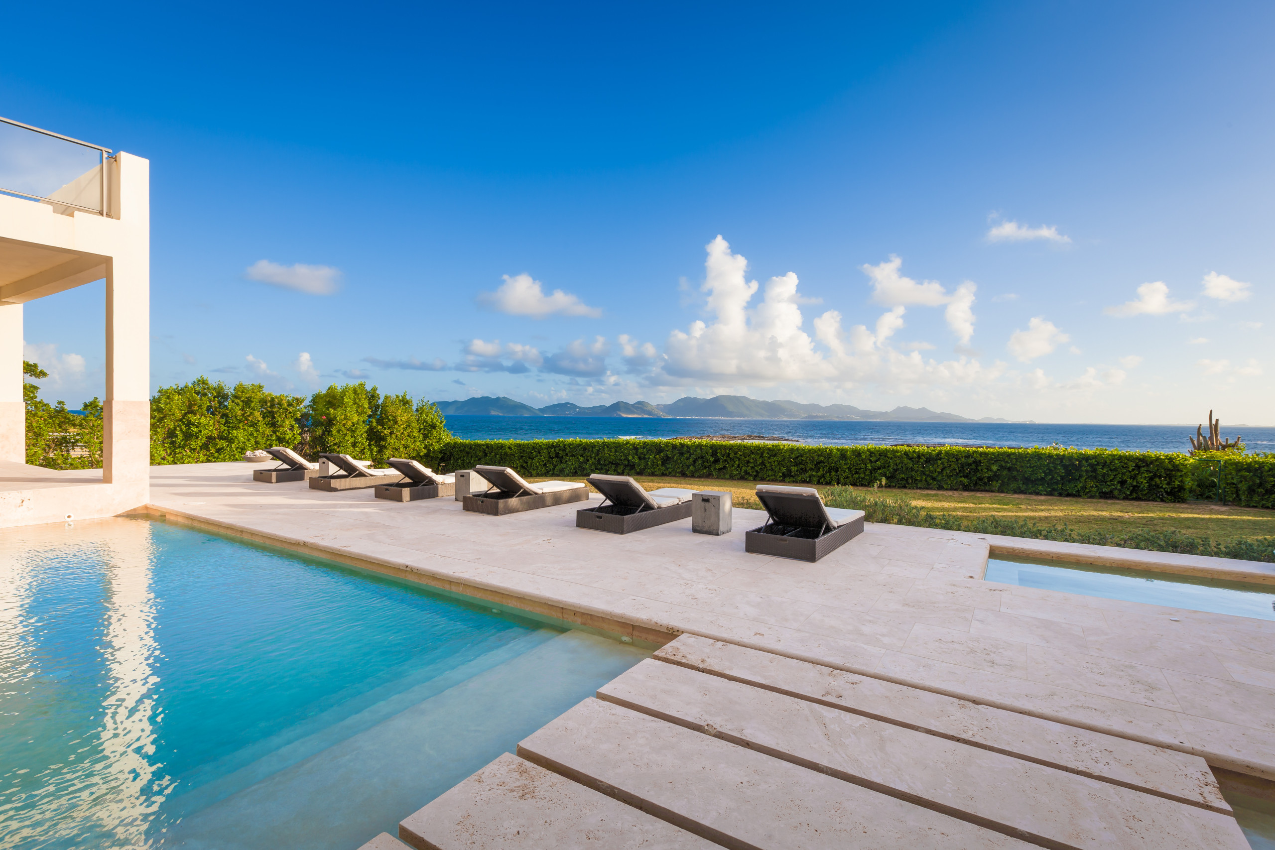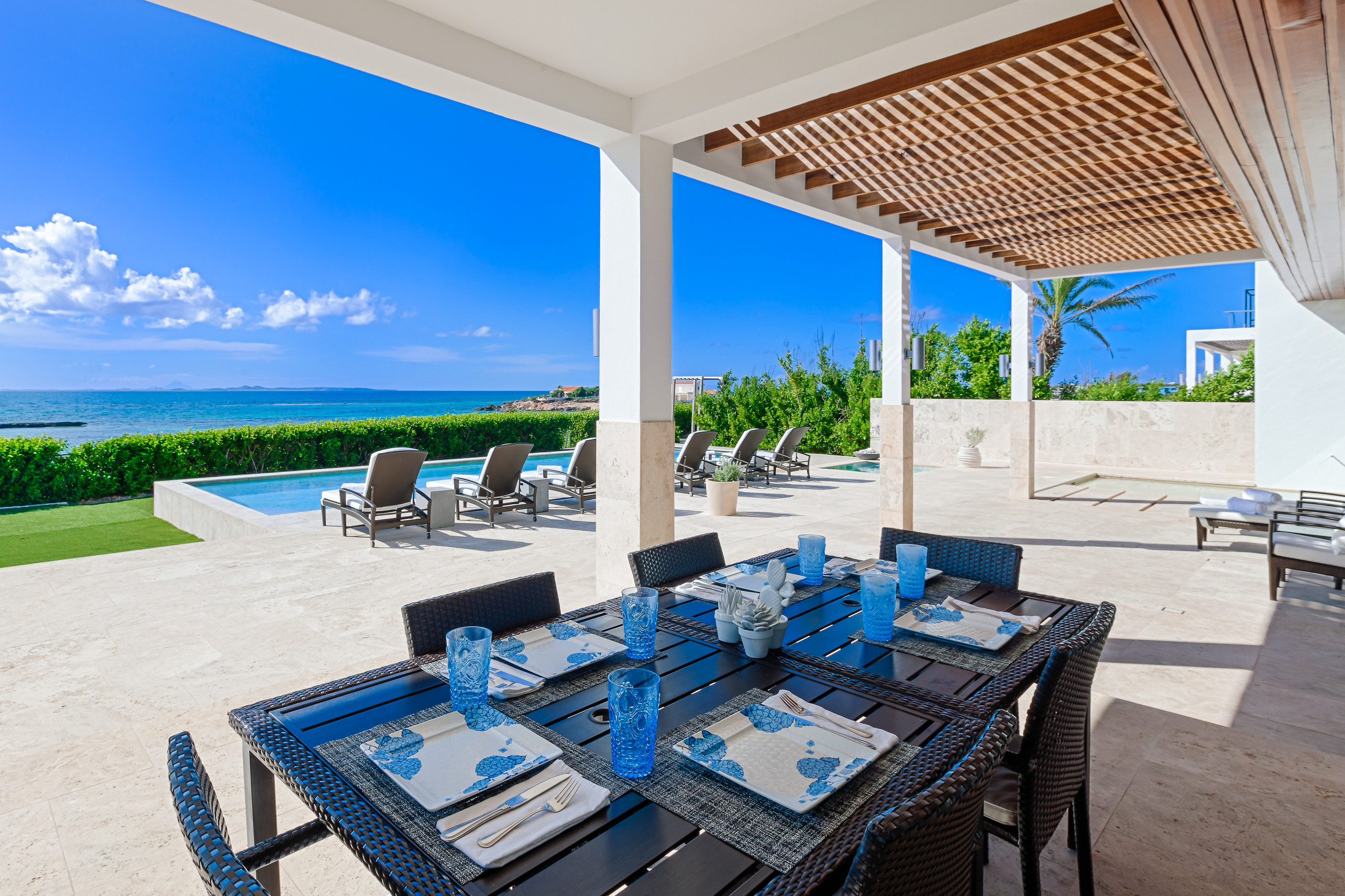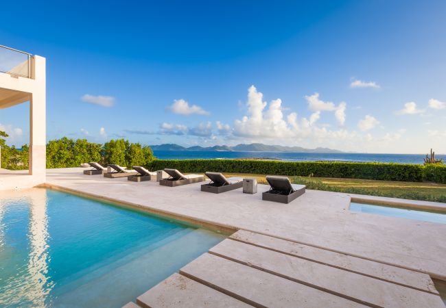 Unwind by the private heated pool under crisp white umbrellas while taking in the mesmerizing views of the Caribbean Sea and neighboring St. Martin. The expansive poolside area is designed for ultimate relaxation and entertainment, featuring a covered lounge and dining space, a poolside bar with an ice maker and fridge, a BBQ grill, ample sun loungers, and a spacious terrace. The elevated veranda is elegantly furnished with plush seating, ceiling fans, and ambient lighting, making it the perfect setting for any time of day. For added convenience, a changing room and restroom are located just off the pool deck.
