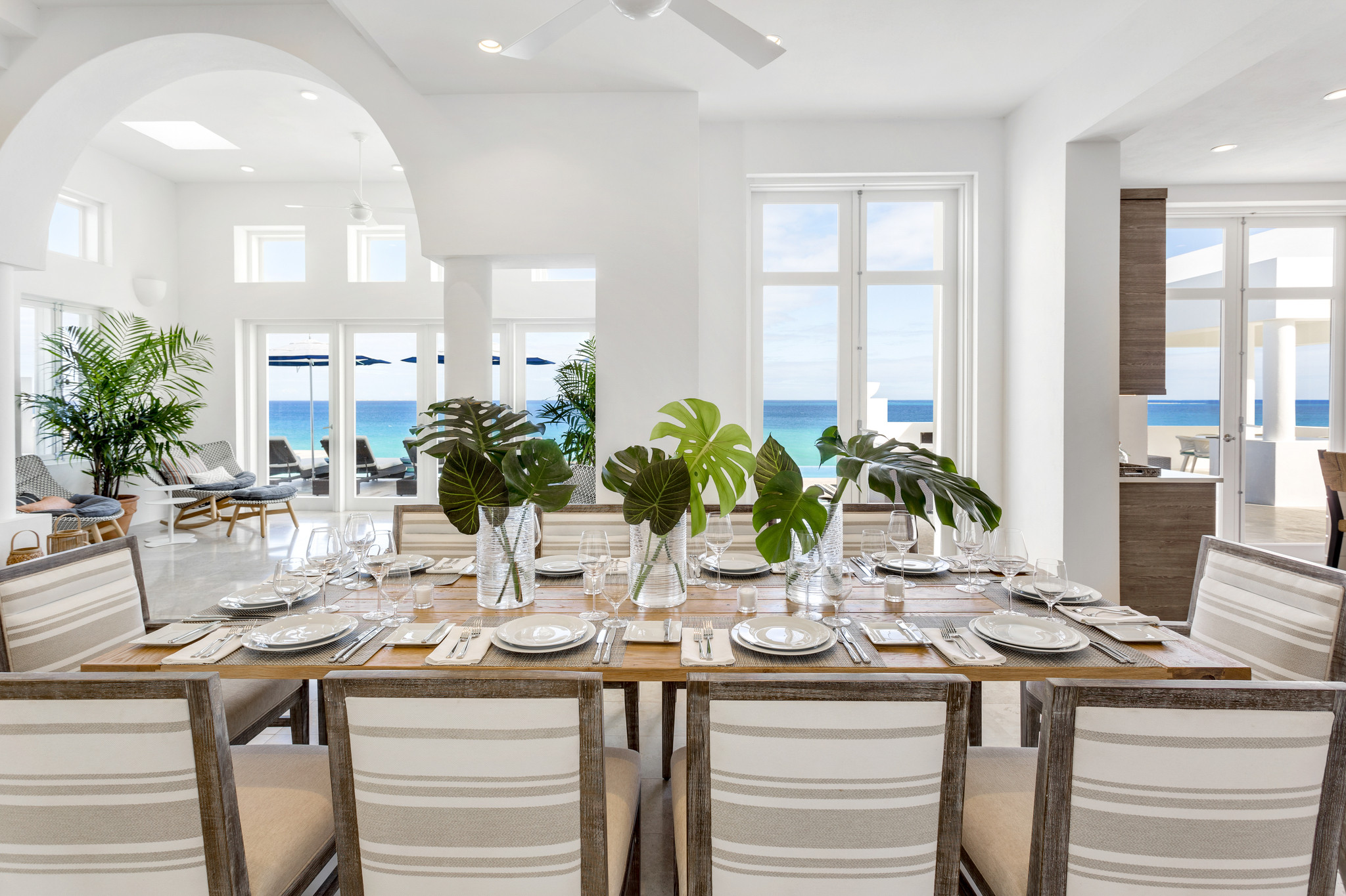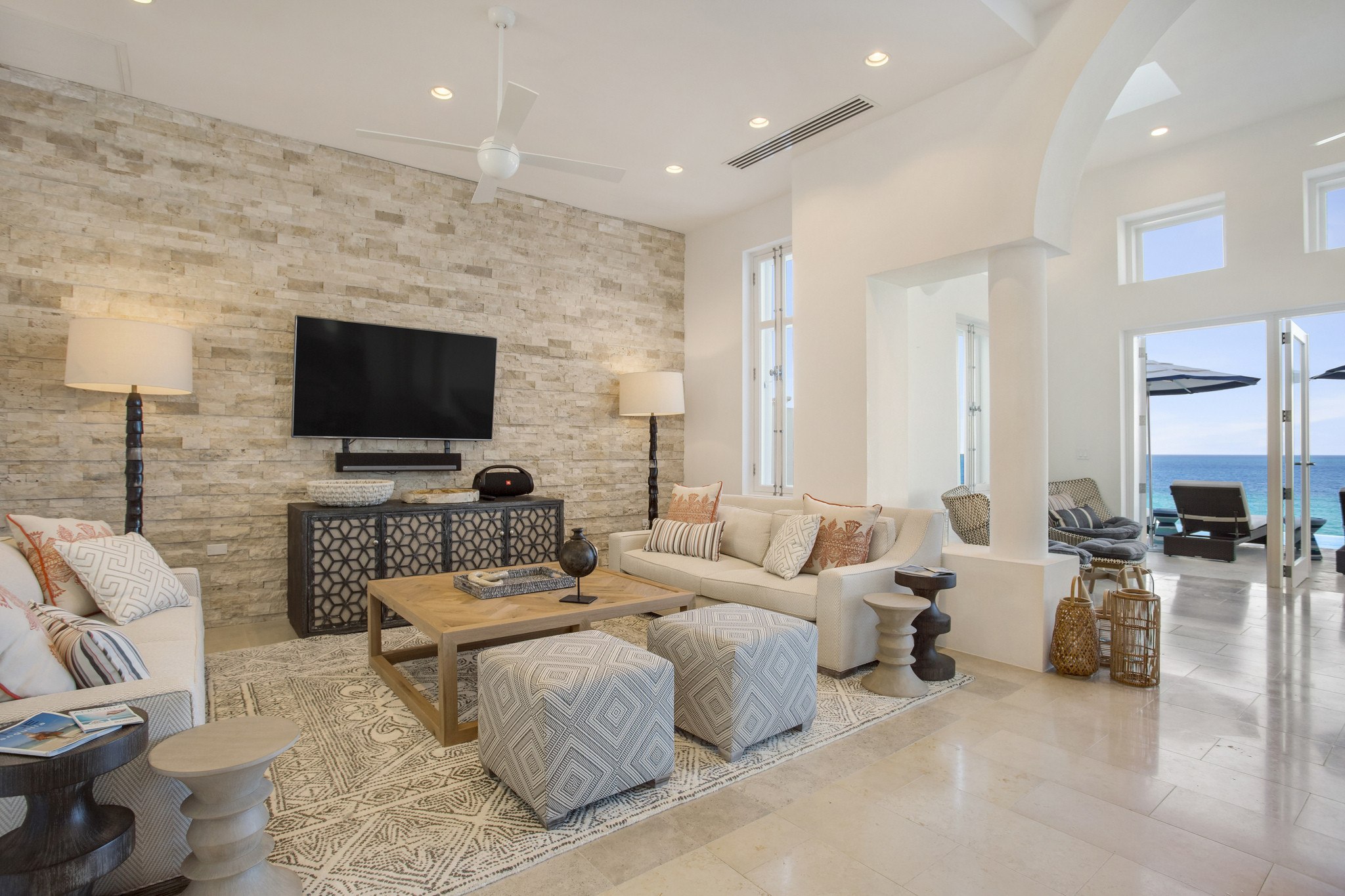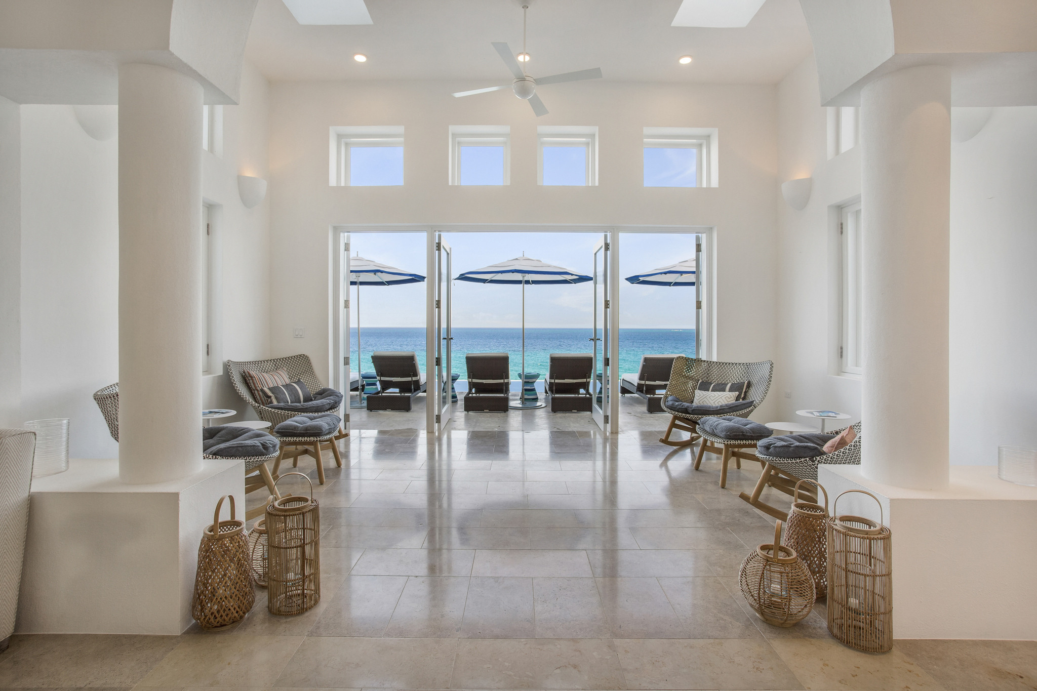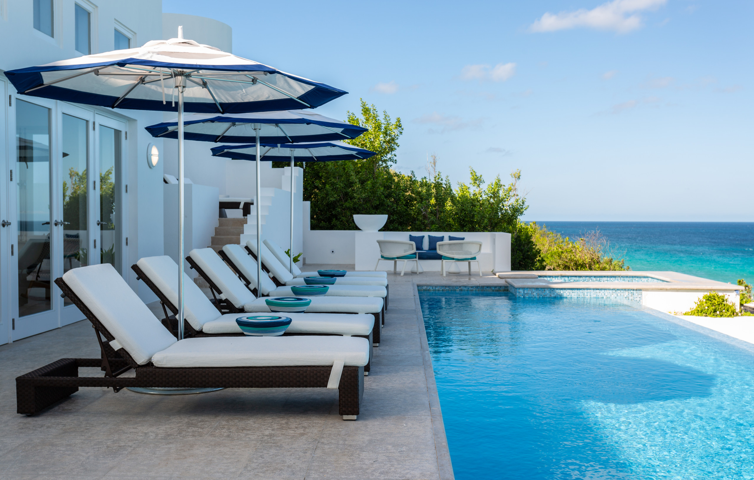 Inside, expansive living spaces flow seamlessly to outdoor terraces overlooking the turquoise sea. The elegant great room, formal dining area, and gourmet kitchen set the stage for effortless island living, while large glass doors open to an infinity pool, Jacuzzi, and shaded alfresco dining area.