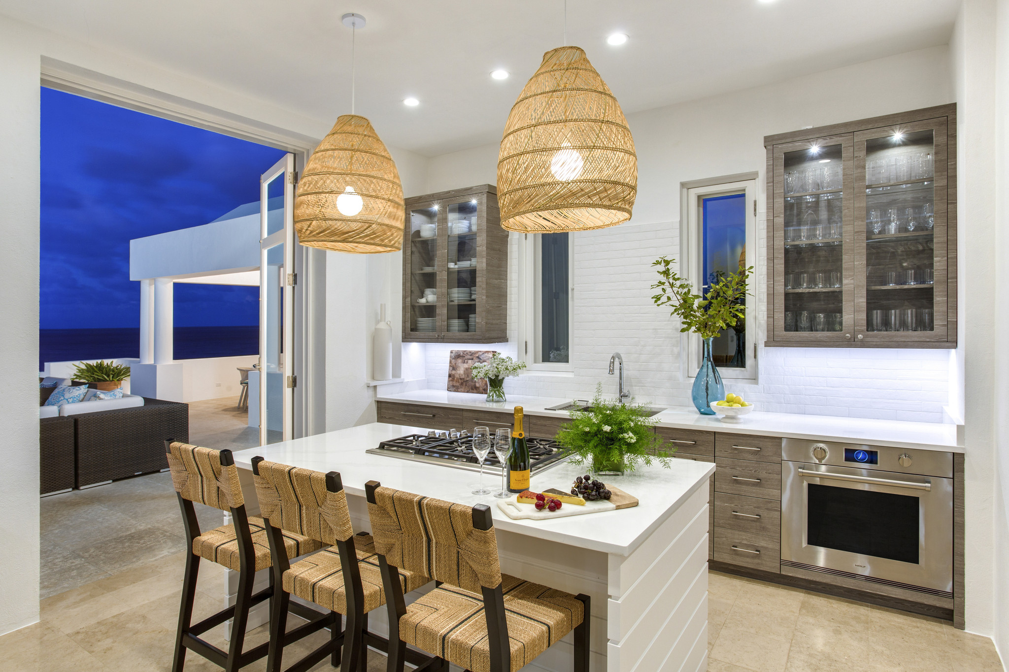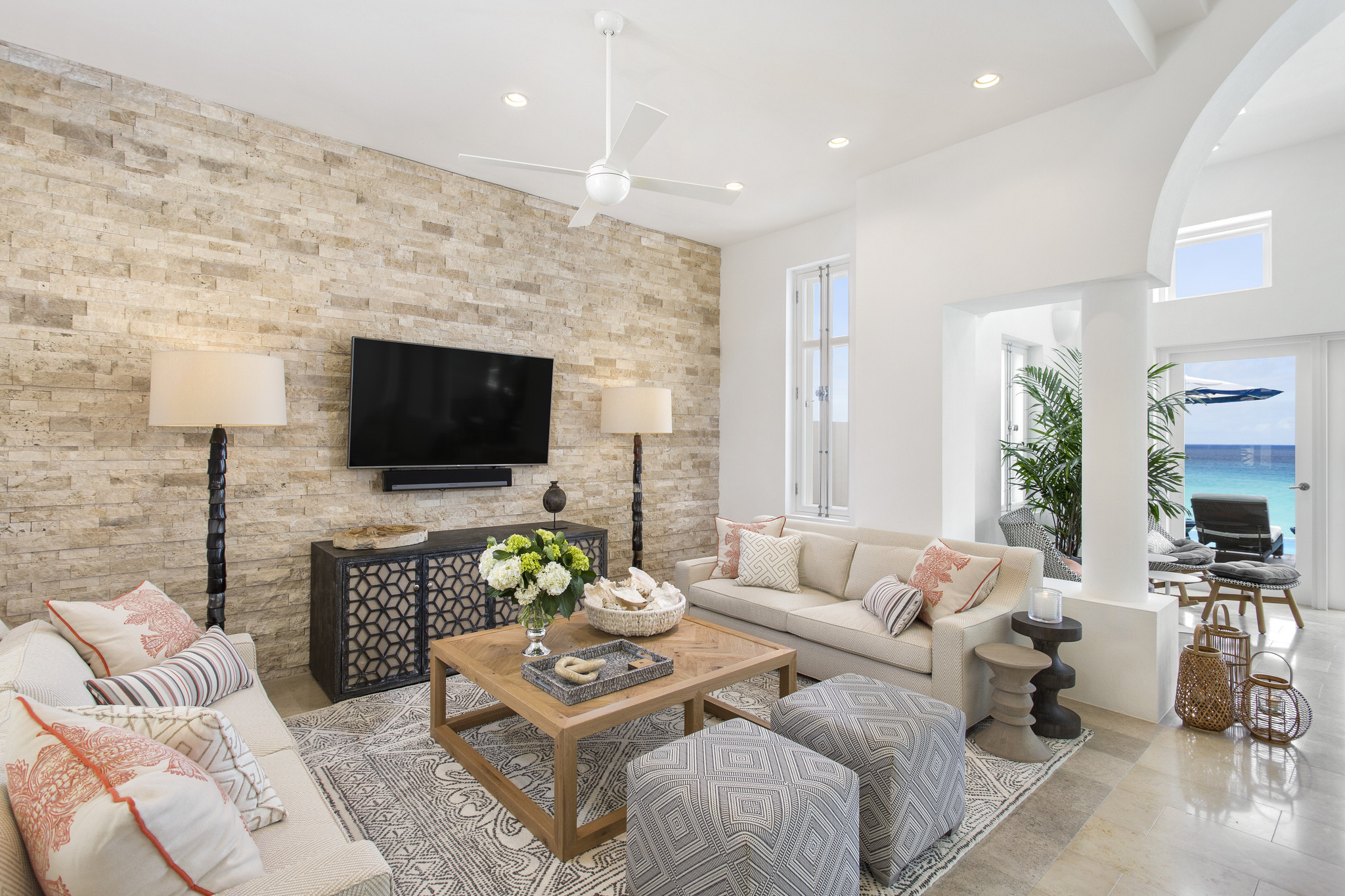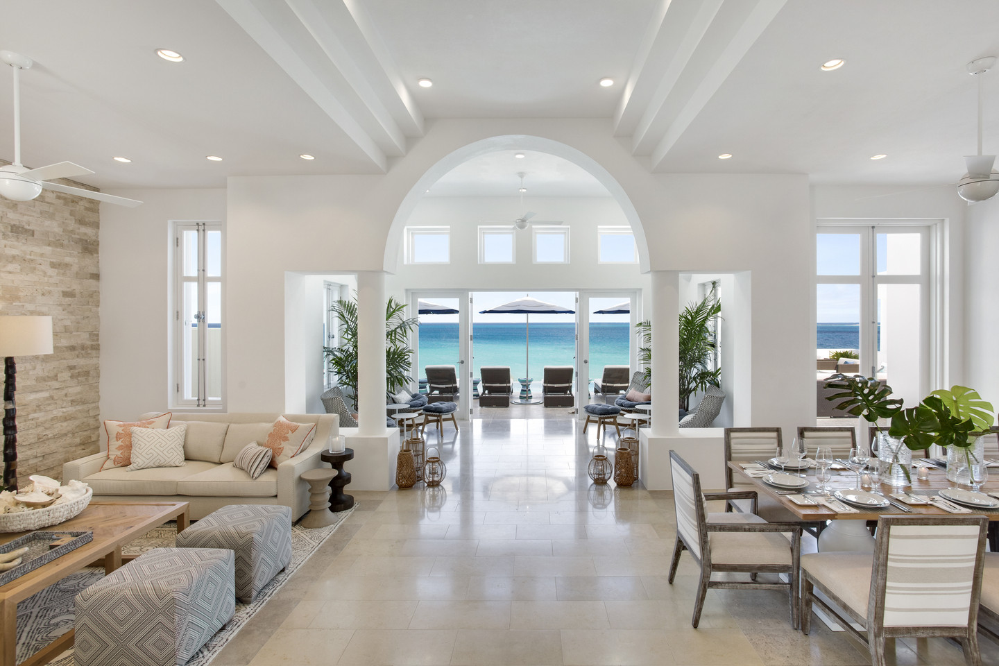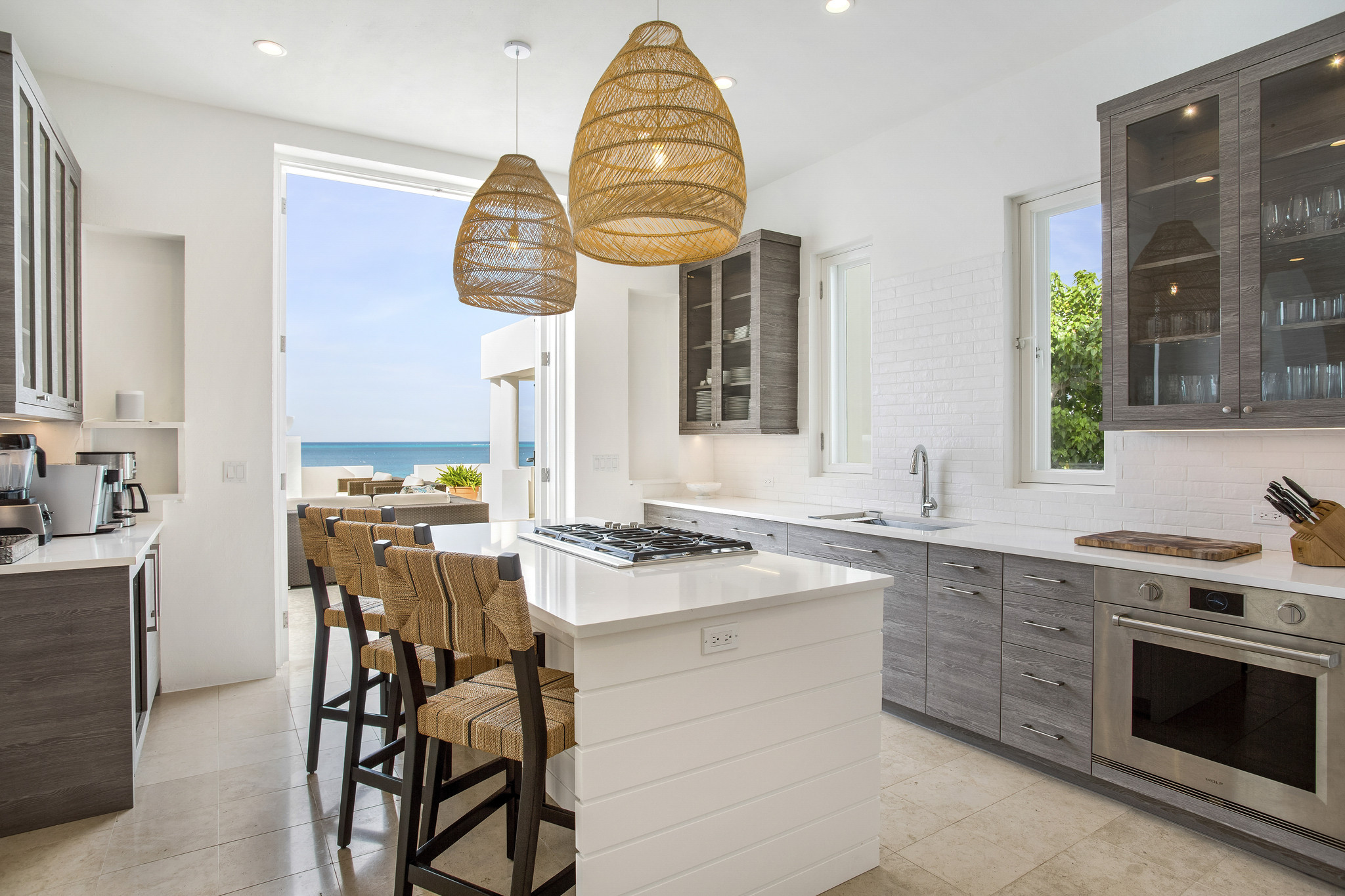 Inside, expansive living spaces flow seamlessly to outdoor terraces overlooking the turquoise sea. The elegant great room, formal dining area, and gourmet kitchen set the stage for effortless island living, while large glass doors open to an infinity pool, Jacuzzi, and shaded alfresco dining area.