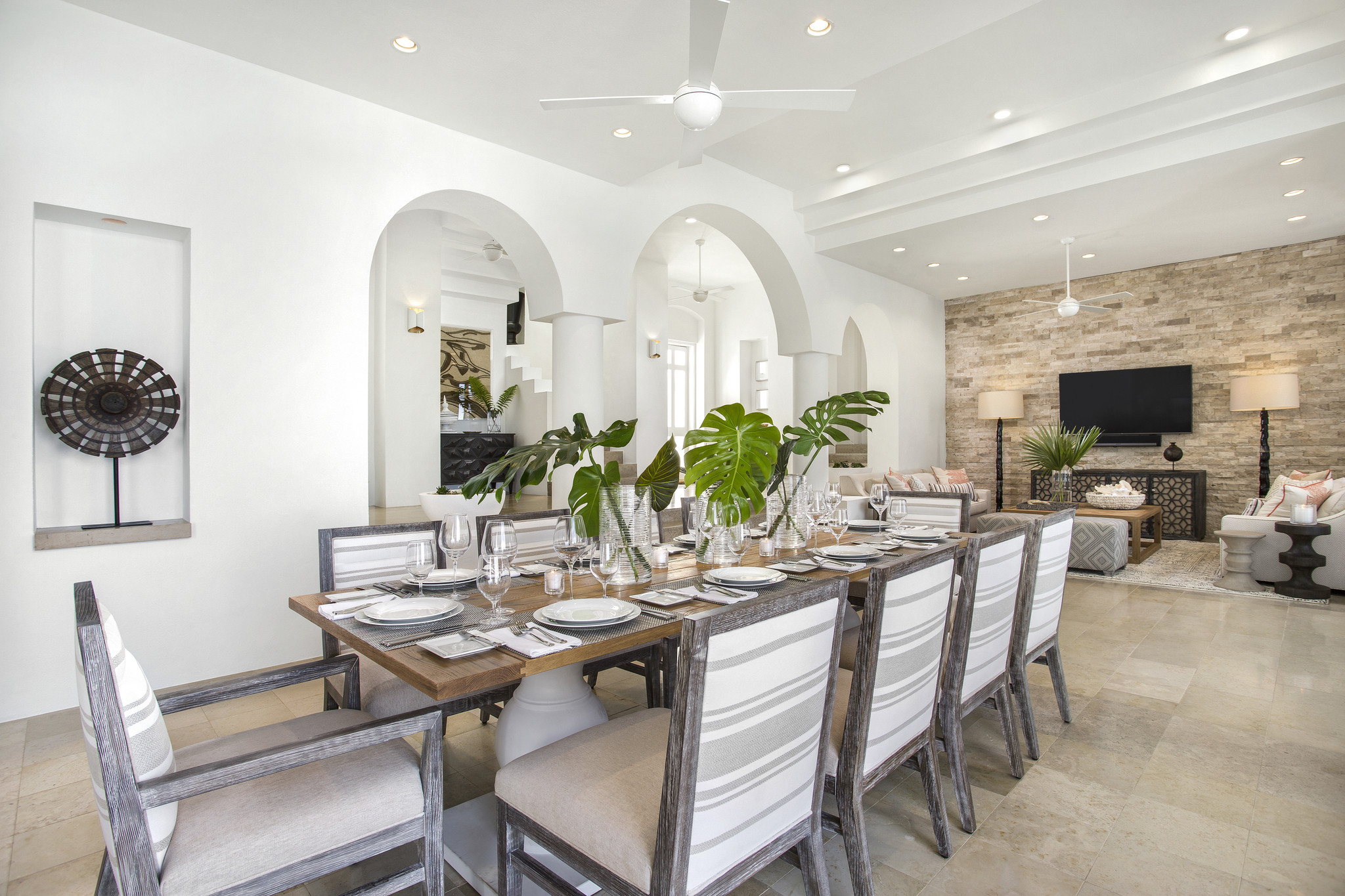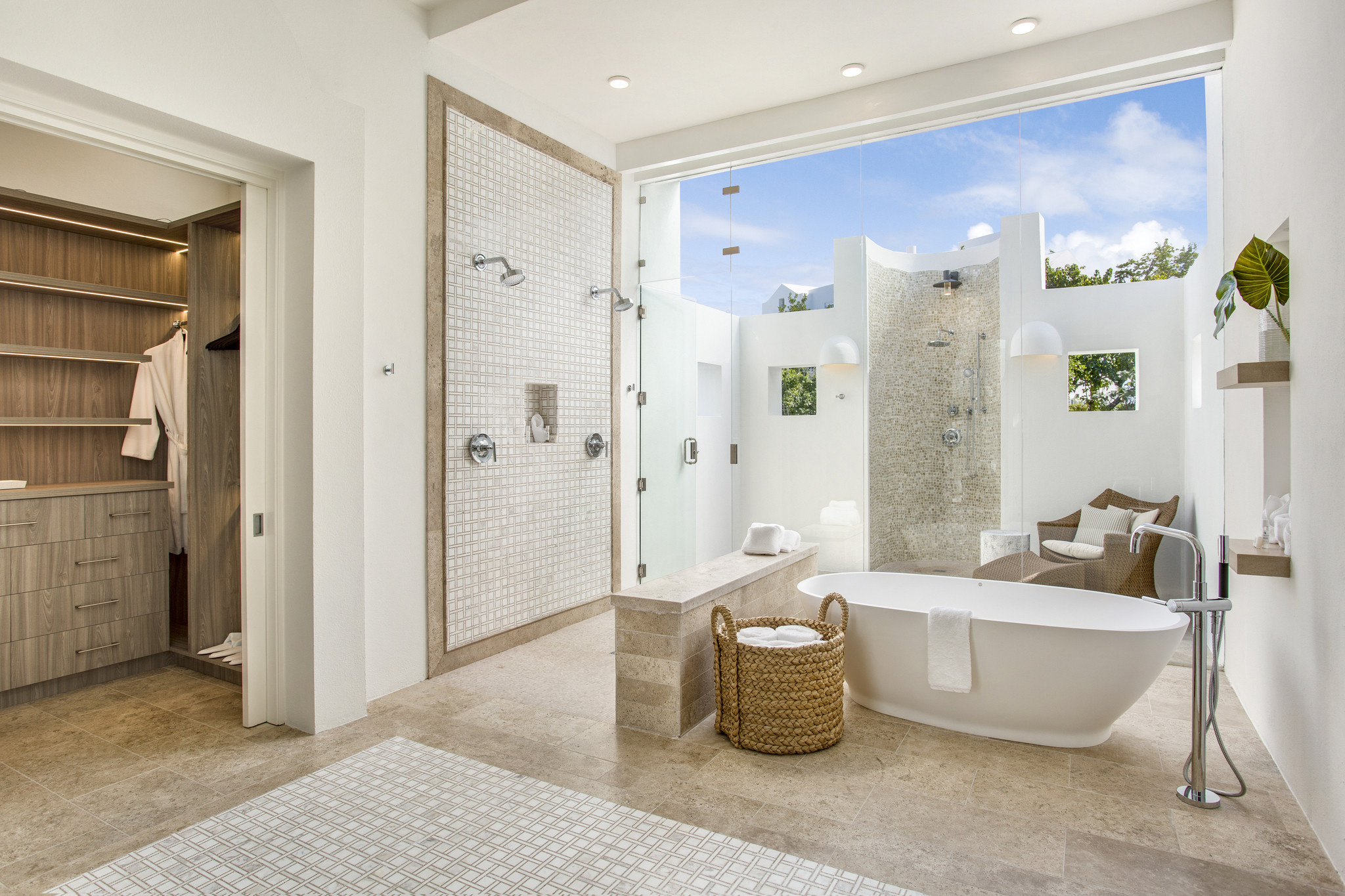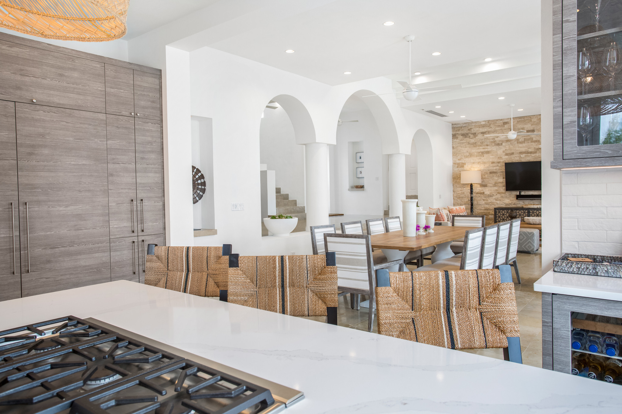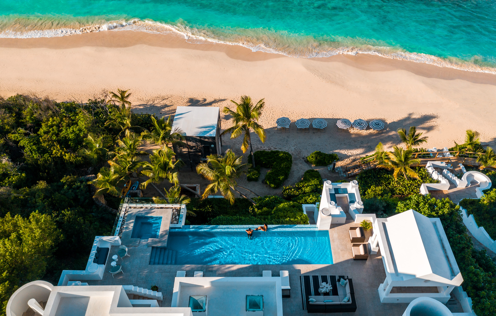 Inside, expansive living spaces flow seamlessly to outdoor terraces overlooking the turquoise sea. The elegant great room, formal dining area, and gourmet kitchen set the stage for effortless island living, while large glass doors open to an infinity pool, Jacuzzi, and shaded alfresco dining area.