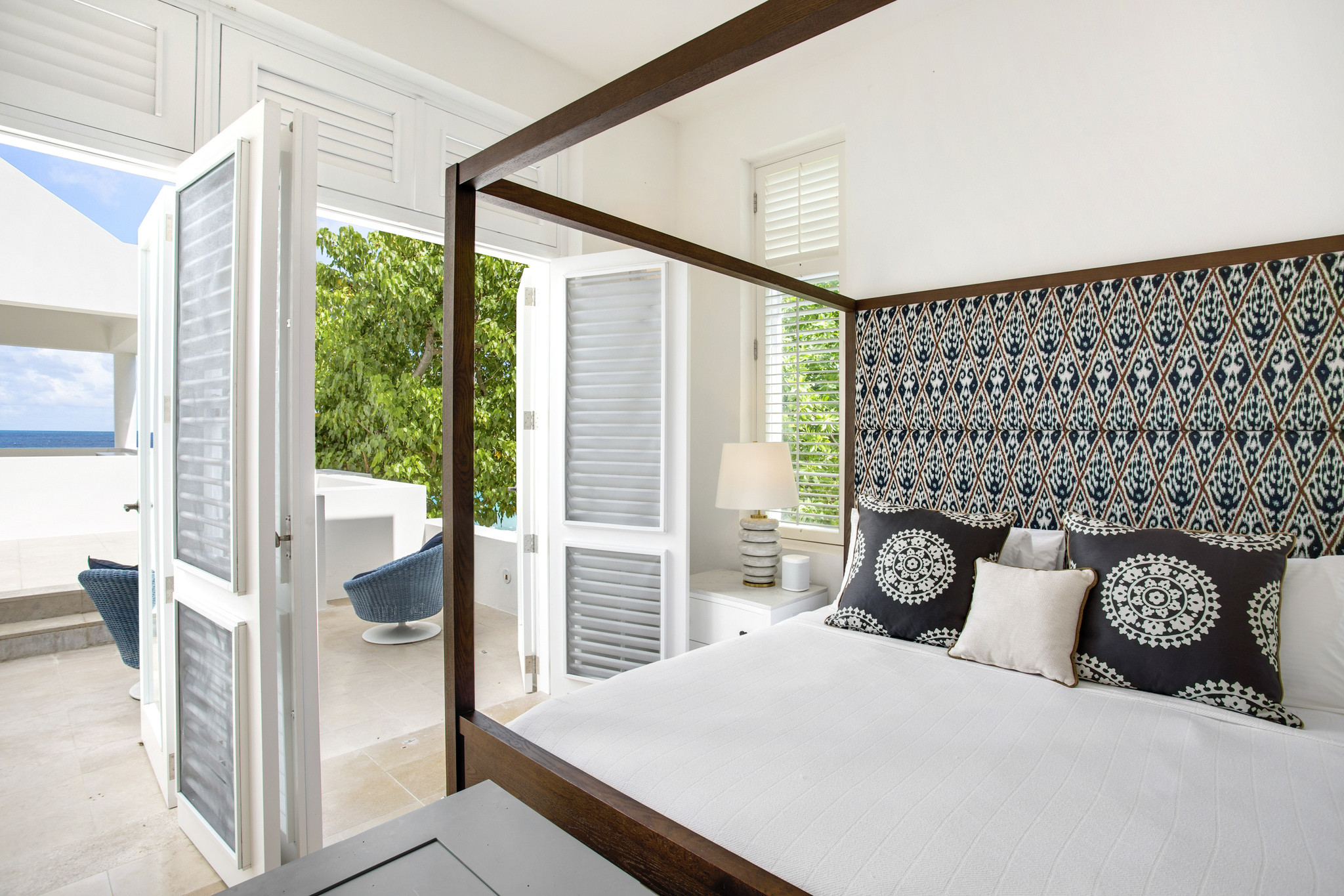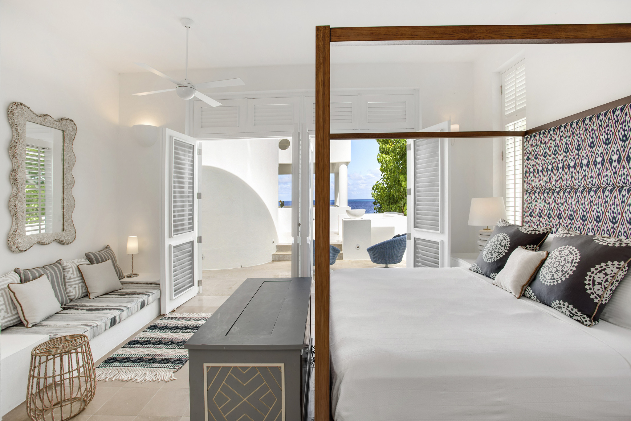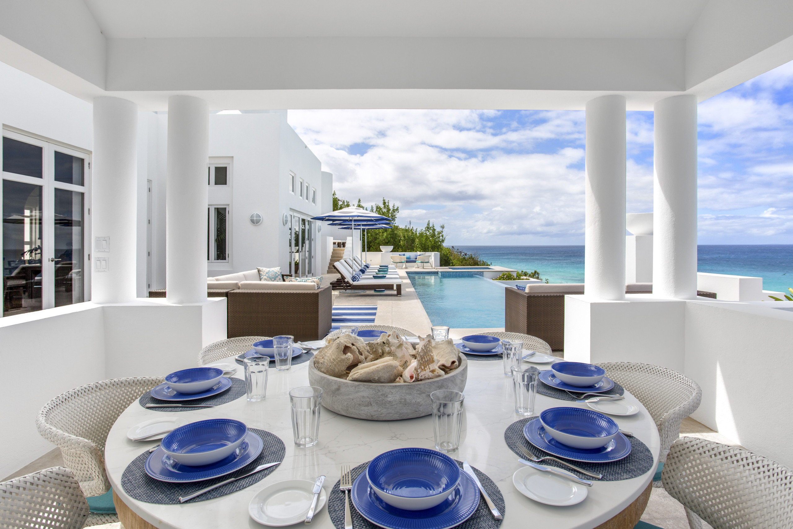 Perched above the white sands of Long Bay, Sea Villa is a five-bedroom luxury retreat offering breathtaking ocean views, private beach access, and the finest in Caribbean elegance. Inspired by classic Greek architecture, the villa’s clean white lines, geometric accents, and tranquil fountains create an atmosphere of timeless sophistication surrounded by lush tropical gardens.
