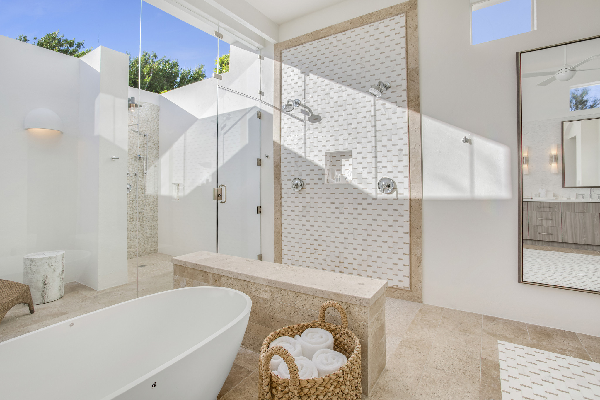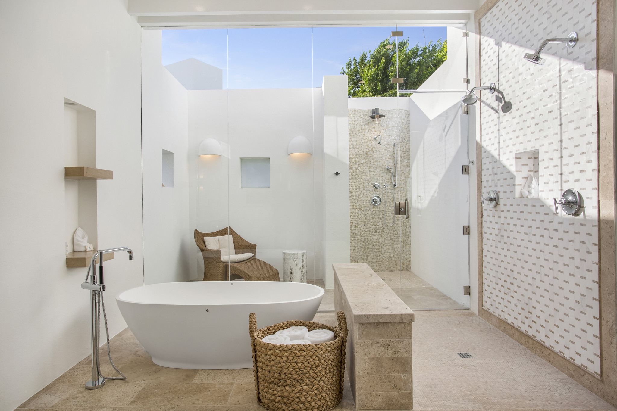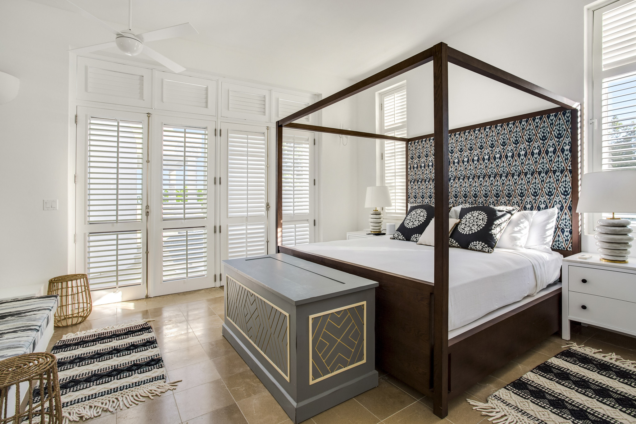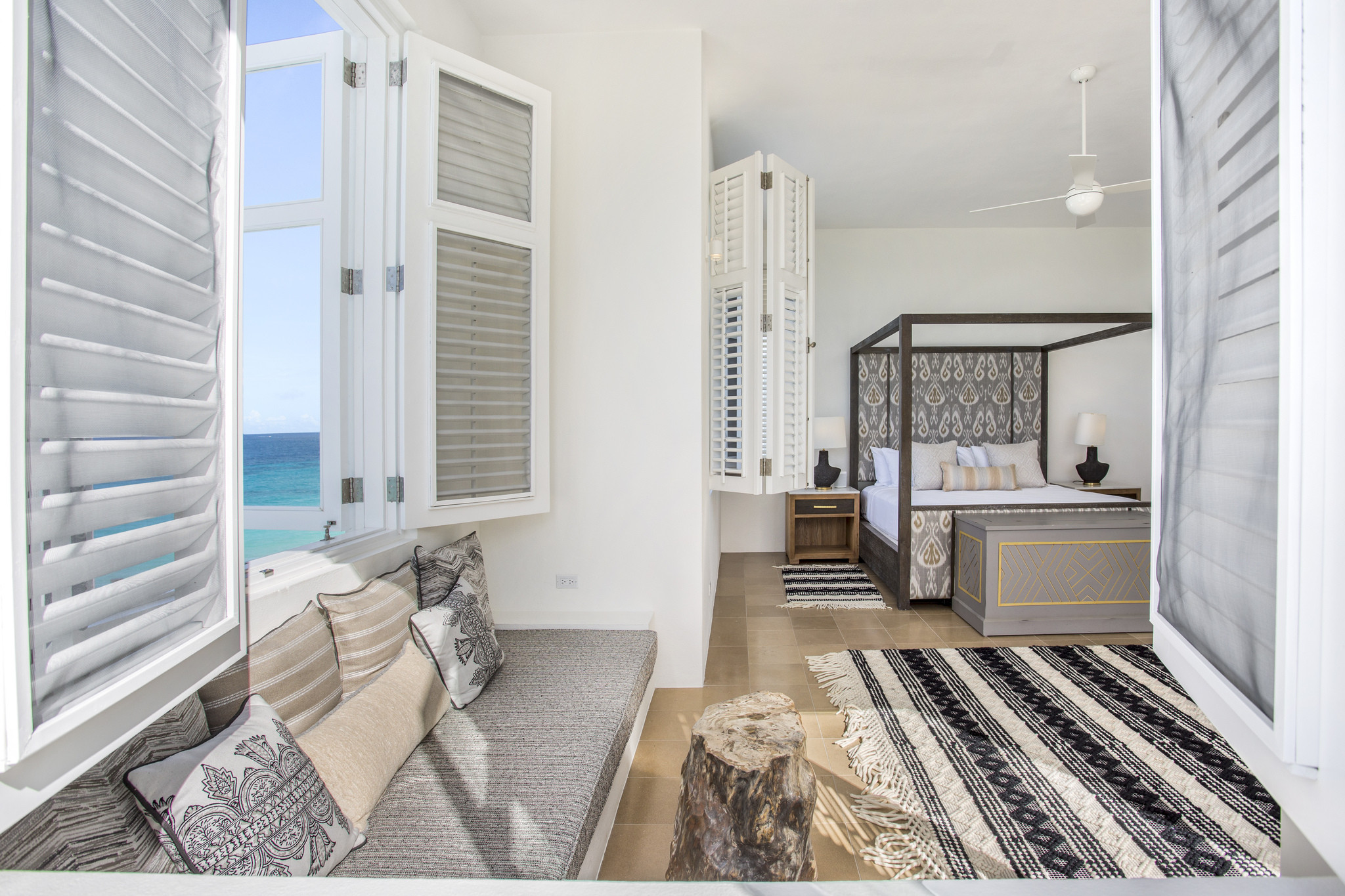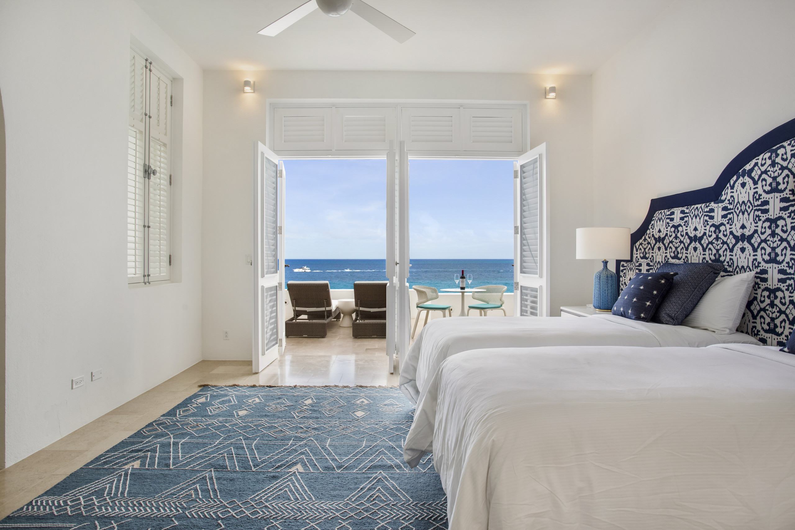 Each of the five bedrooms is a private sanctuary, featuring en-suite marble bathrooms, outdoor showers, and private terraces with ocean views. Guests also enjoy access to a shared fitness center, tennis courts, and watersports.