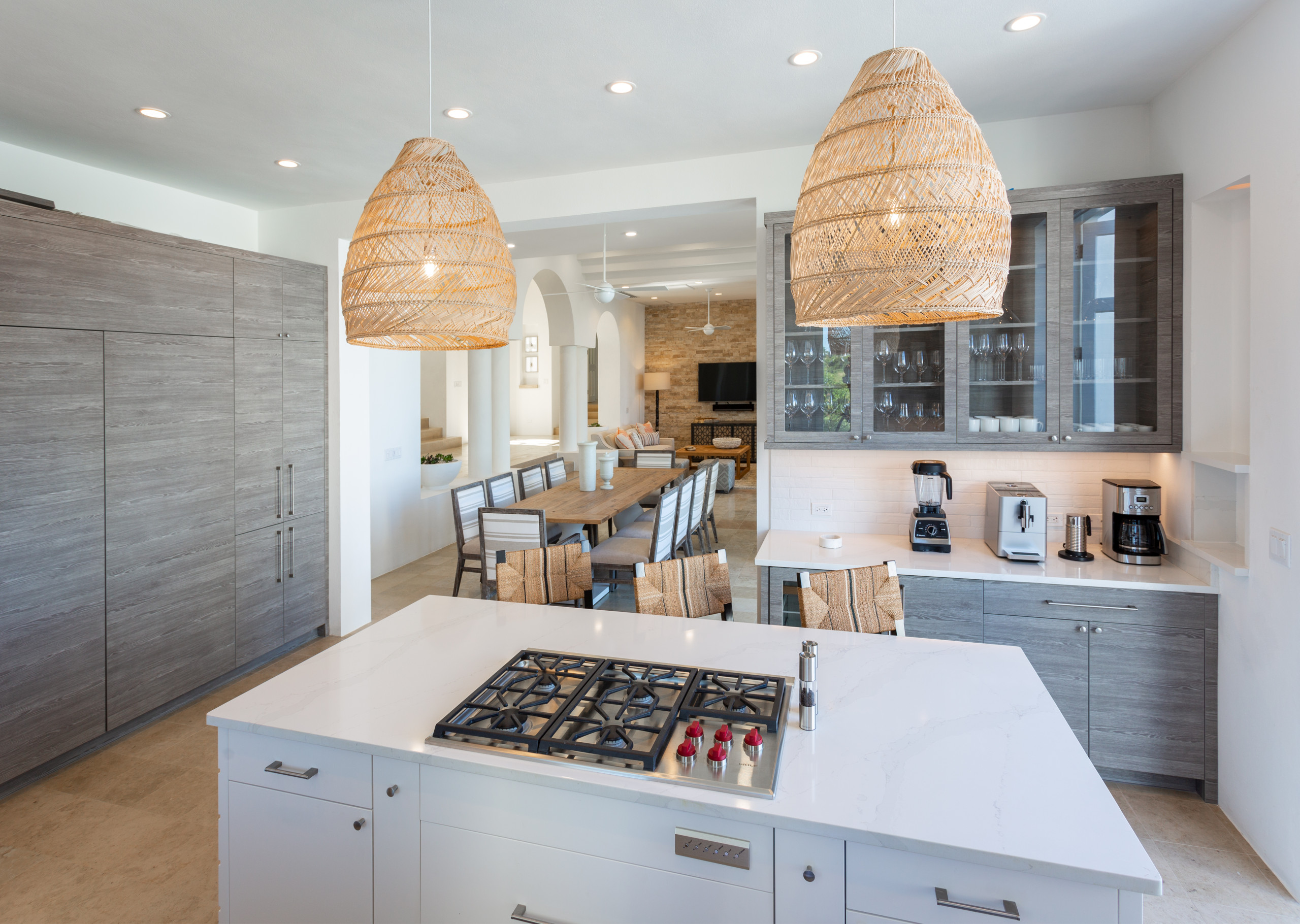 Inside, expansive living spaces flow seamlessly to outdoor terraces overlooking the turquoise sea. The elegant great room, formal dining area, and gourmet kitchen set the stage for effortless island living, while large glass doors open to an infinity pool, Jacuzzi, and shaded alfresco dining area.