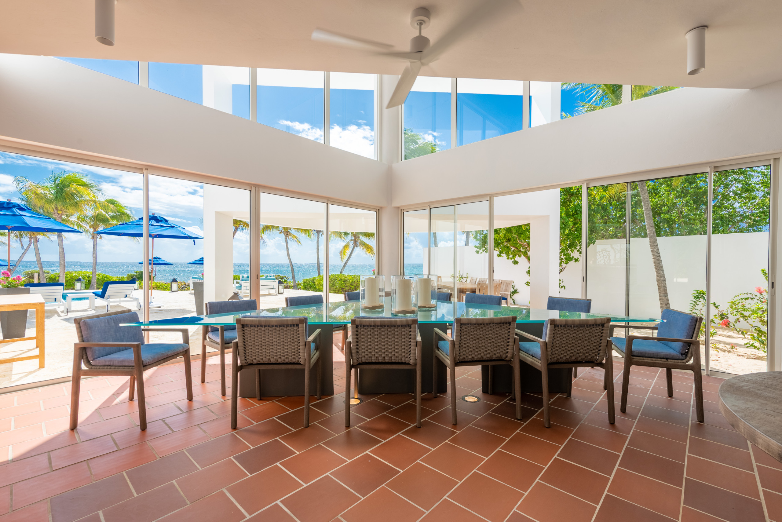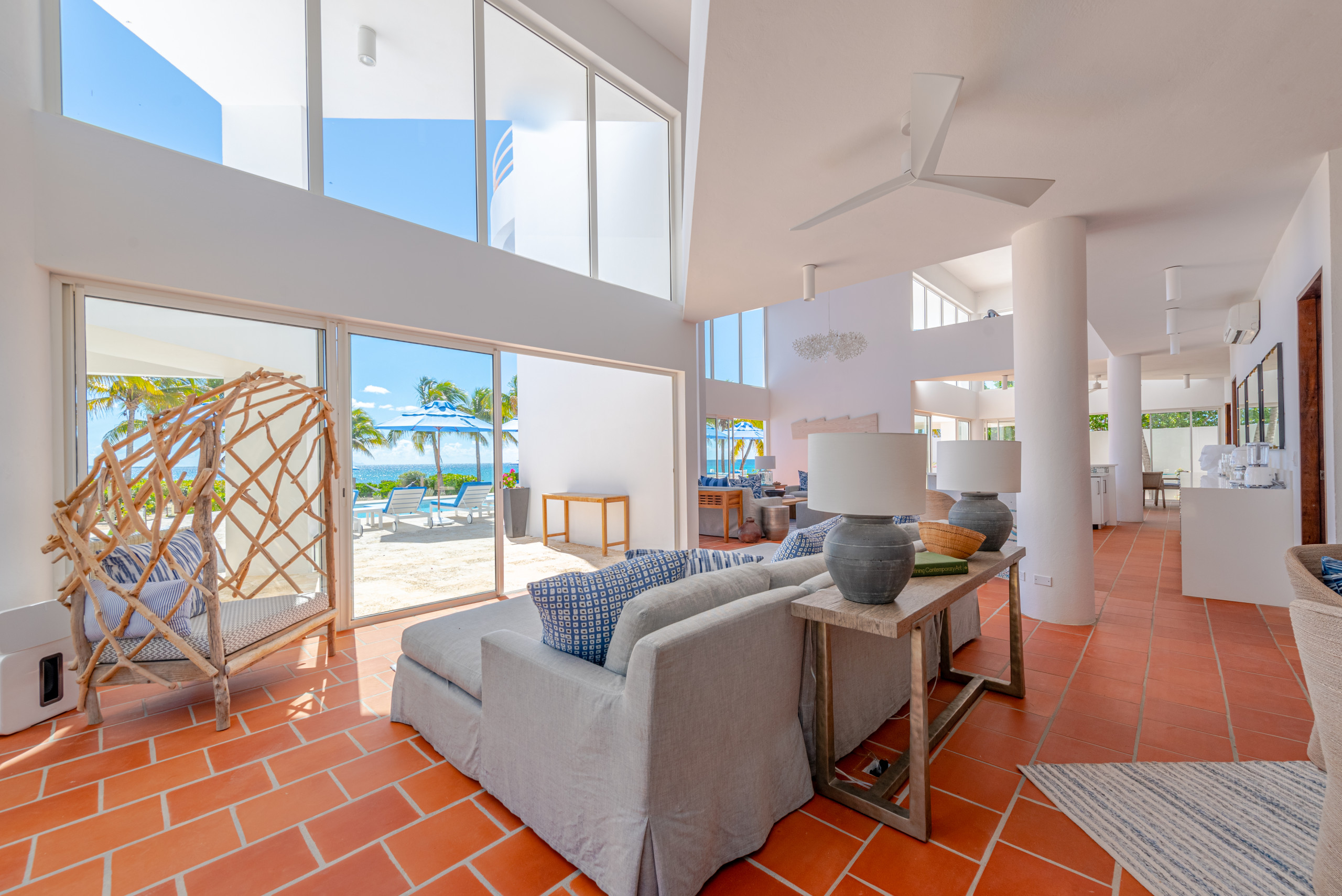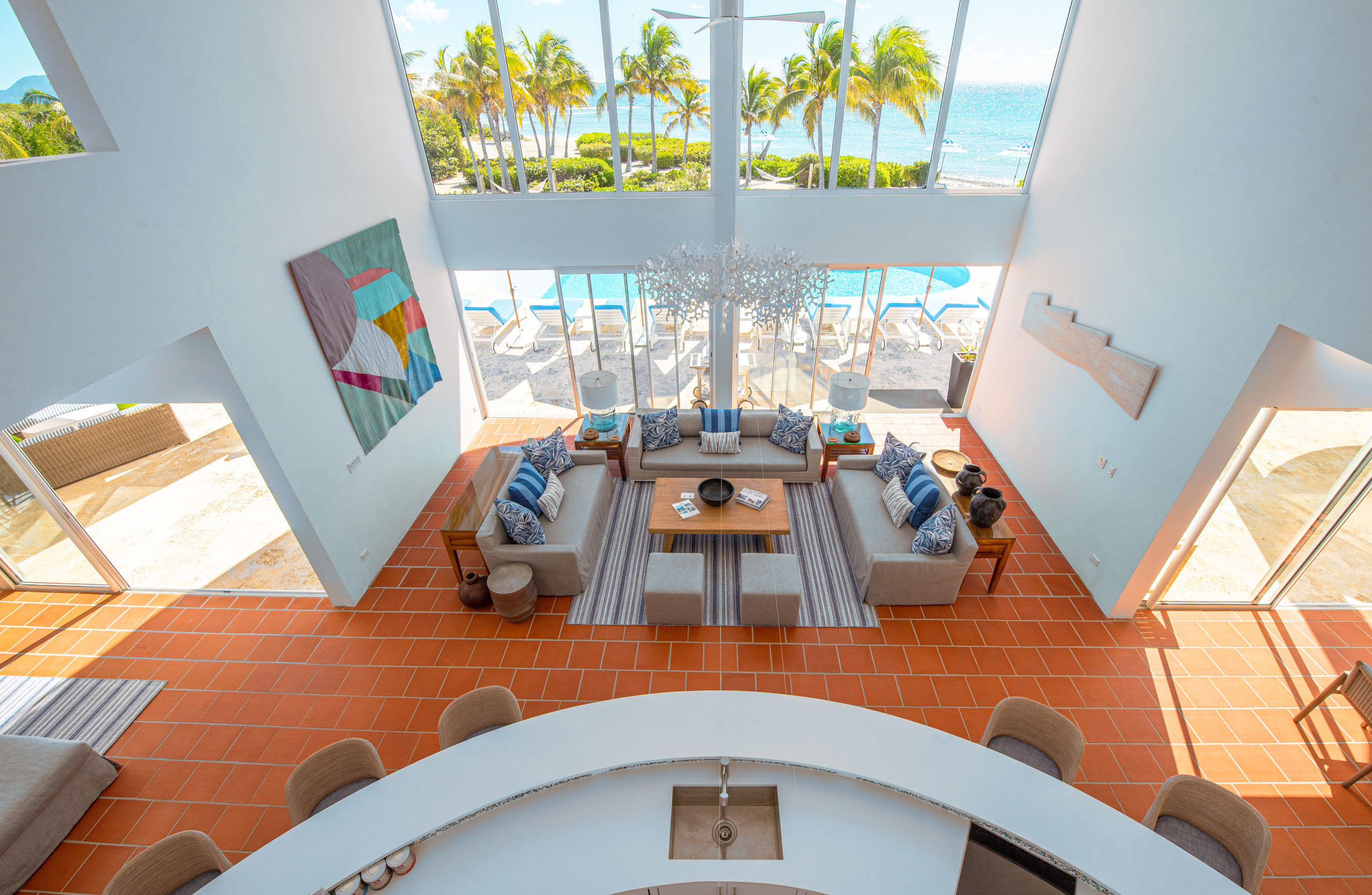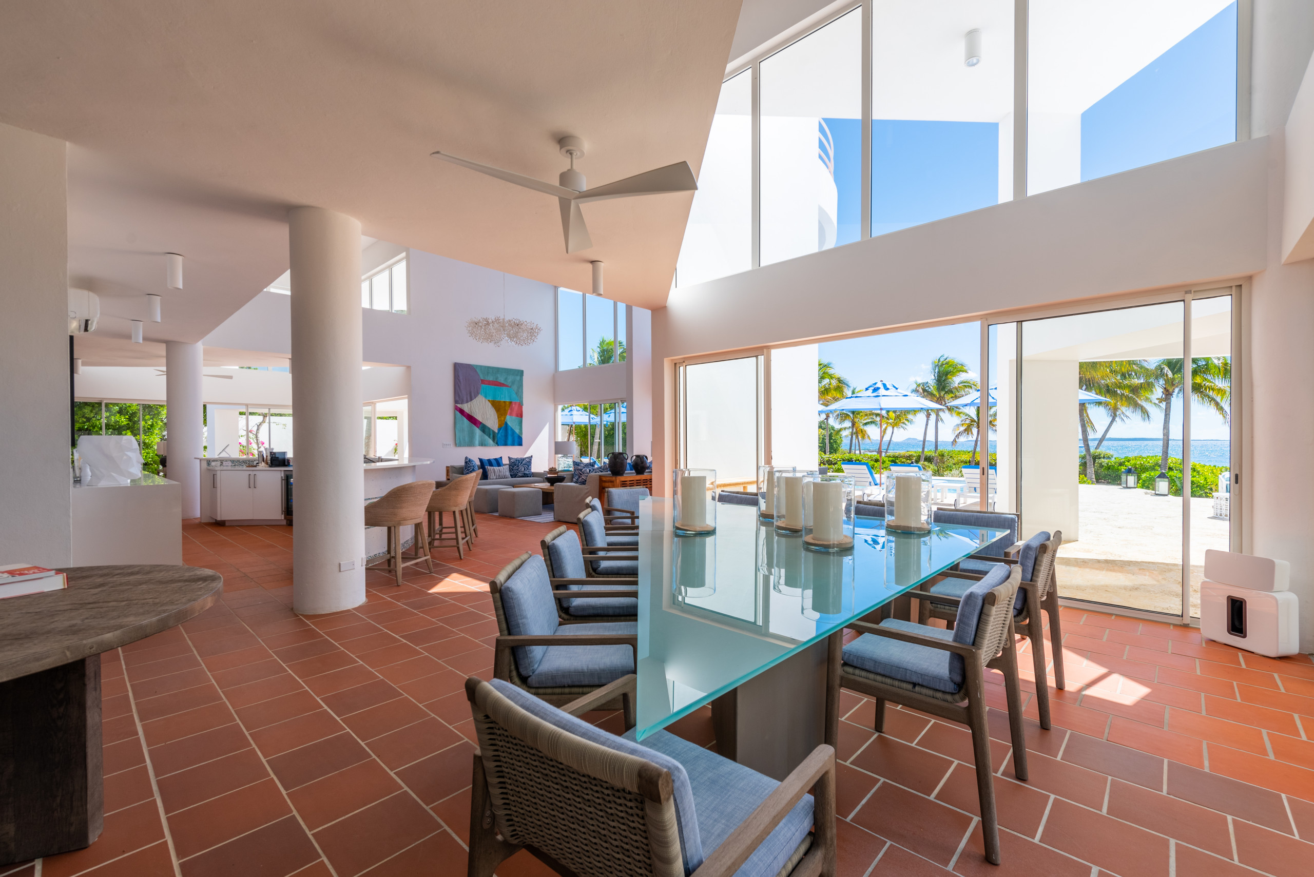 The first floor showcases a grand open-plan living area with soaring 21-foot ceilings, floor-to-ceiling windows, and French doors that open directly to the heated outdoor pool terrace. Multiple lounge areas and a large dining table provide the perfect setting for entertaining or intimate gatherings, while the seamless indoor-outdoor flow allows guests to immerse themselves in the tropical surroundings.