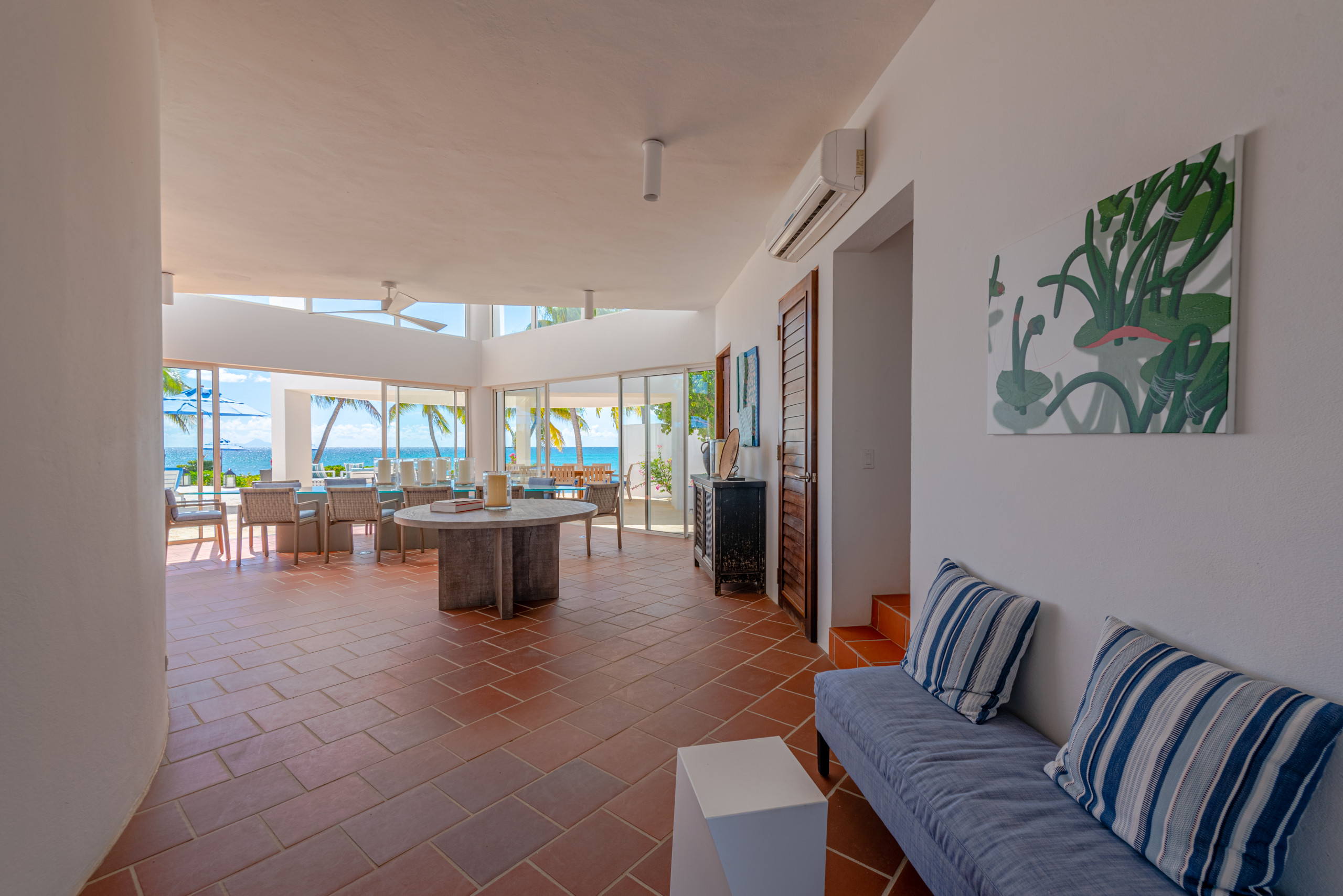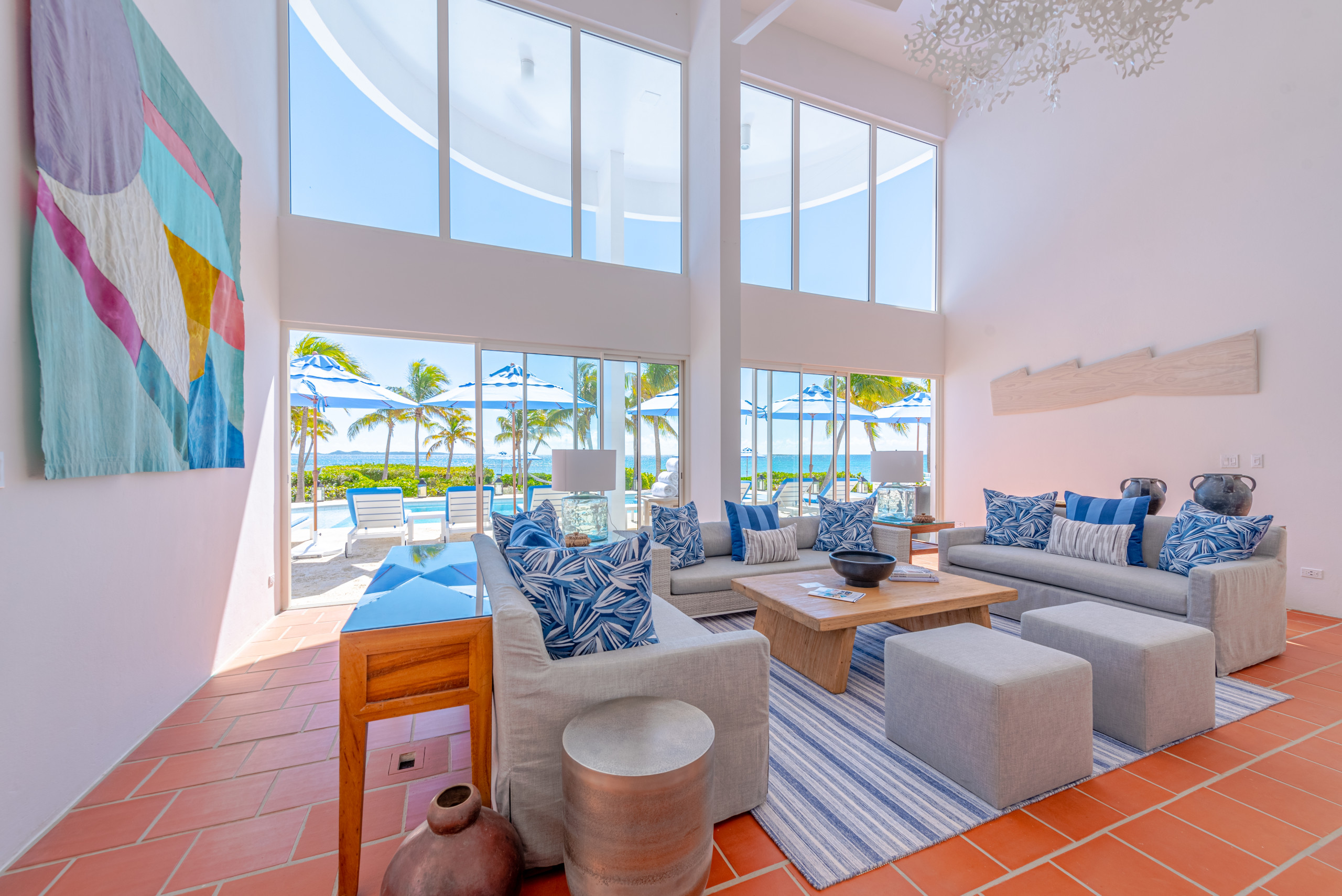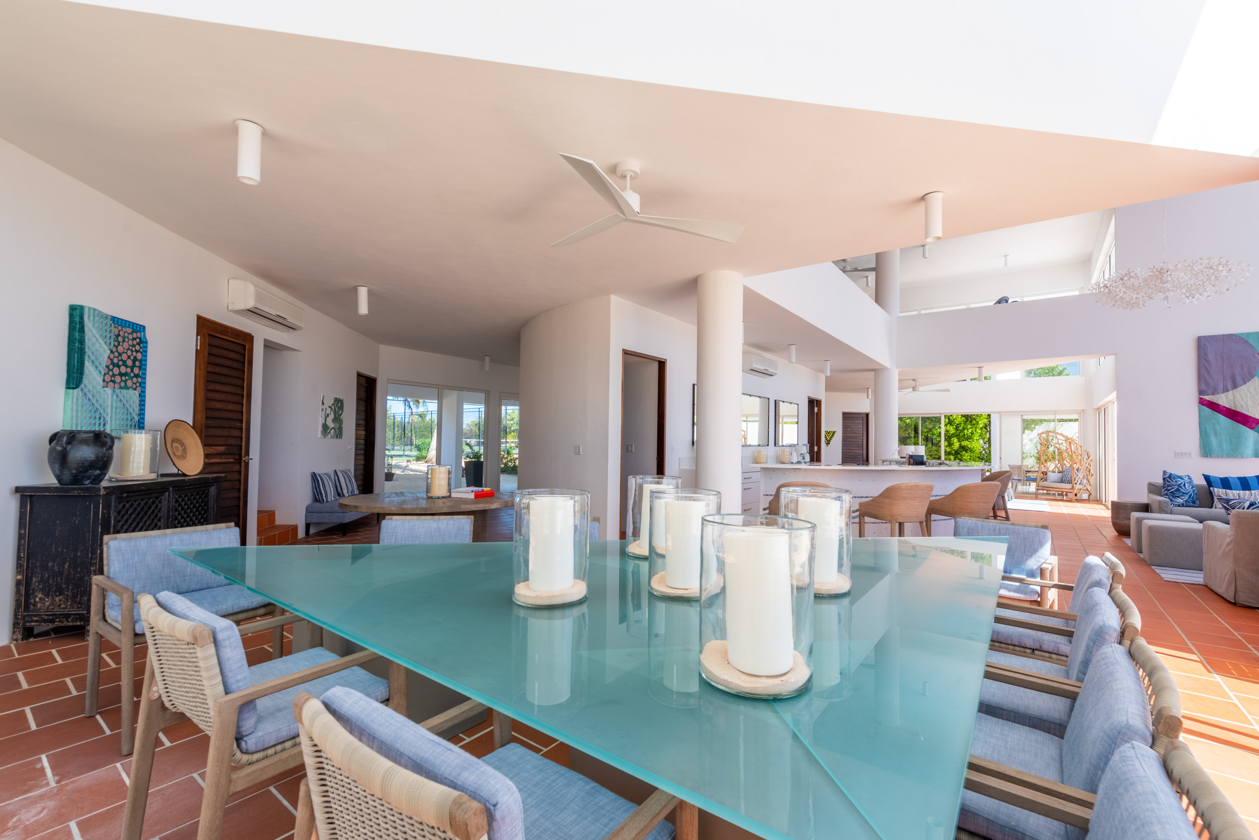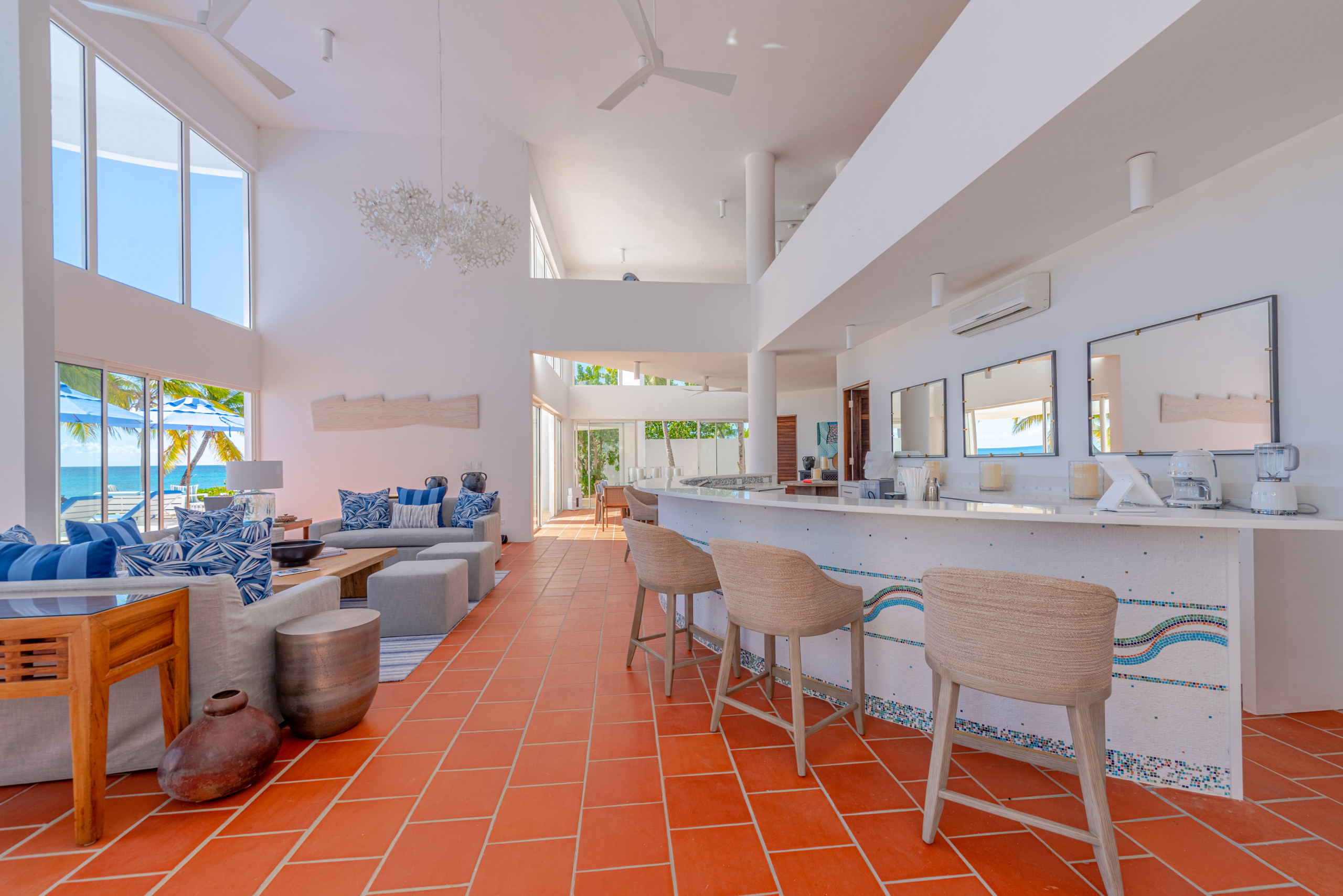 The first floor showcases a grand open-plan living area with soaring 21-foot ceilings, floor-to-ceiling windows, and French doors that open directly to the heated outdoor pool terrace. Multiple lounge areas and a large dining table provide the perfect setting for entertaining or intimate gatherings, while the seamless indoor-outdoor flow allows guests to immerse themselves in the tropical surroundings.