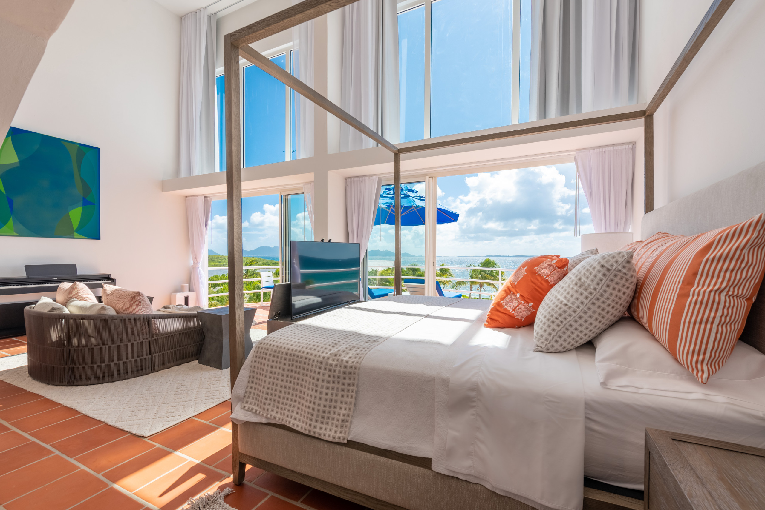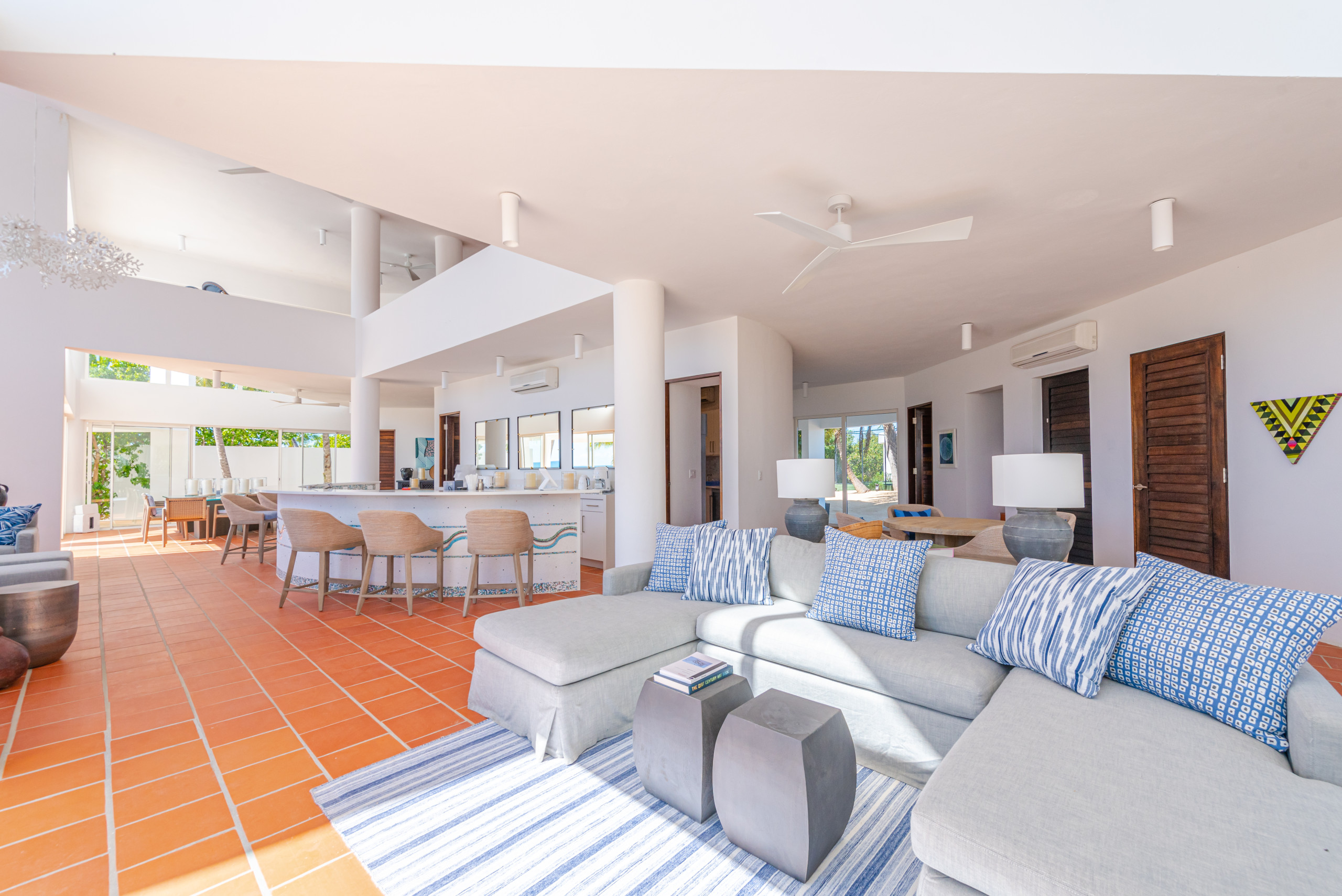 Blue Diamond accommodates up to 10 guests across 5.5 bedrooms, including a palatial principal suite with a lofted office and private terrace, four additional king-bedded guest suites with en-suite bathrooms, and a half-bedroom with a day bed ideal for younger guests. Every room is outfitted with SONOS Bluetooth speakers, TVs, and modern amenities to ensure absolute comfort.