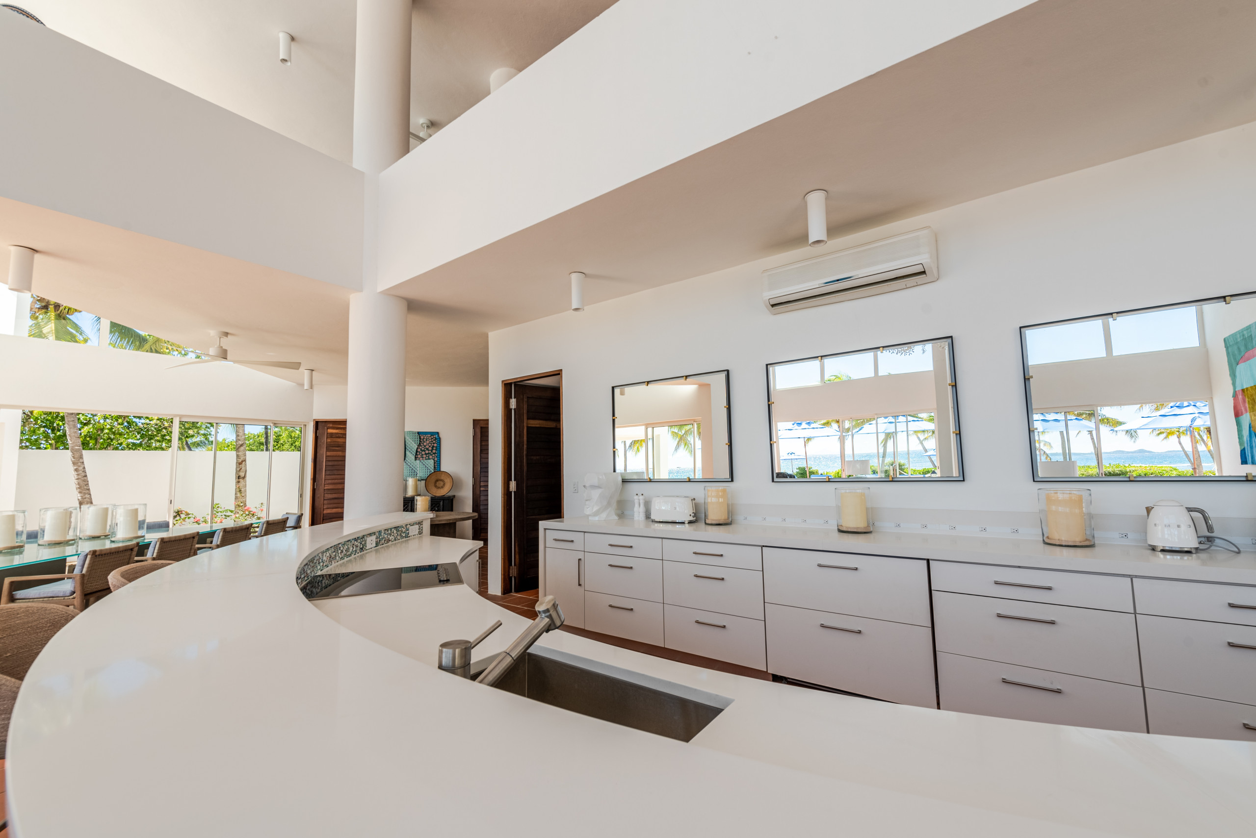 The villa’s first floor is an entertainer’s dream. Soaring 21-foot ceilings and floor-to-ceiling windows flood the space with natural light, while a triangular glass-topped dining table seats fourteen in style. A custom-built semicircle bar, complete with a cooktop, refrigerator, freezer, and wet bar, sets the stage for unforgettable evenings with private chefs or intimate gatherings.