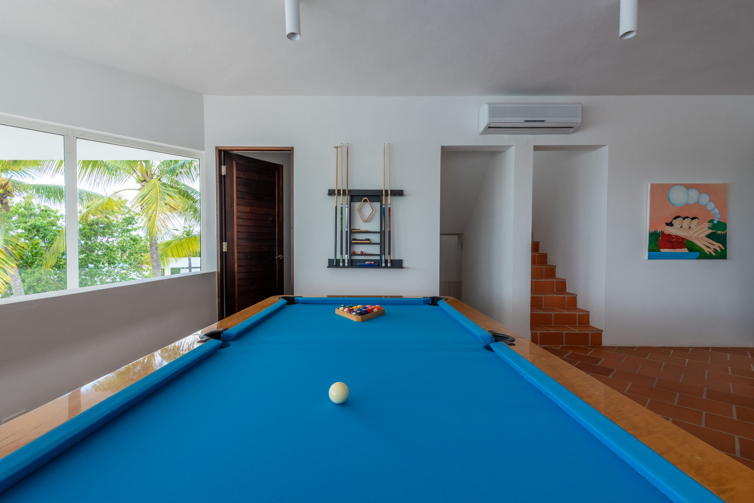 Upstairs, the villa is divided into two zones: a fully equipped entertainment area featuring a custom pool table, card table, and home theater, alongside two guest bedrooms offering peace and privacy. The third floor hosts the principal suite and two additional guest bedrooms, each designed for comfort, elegance, and panoramic ocean views.