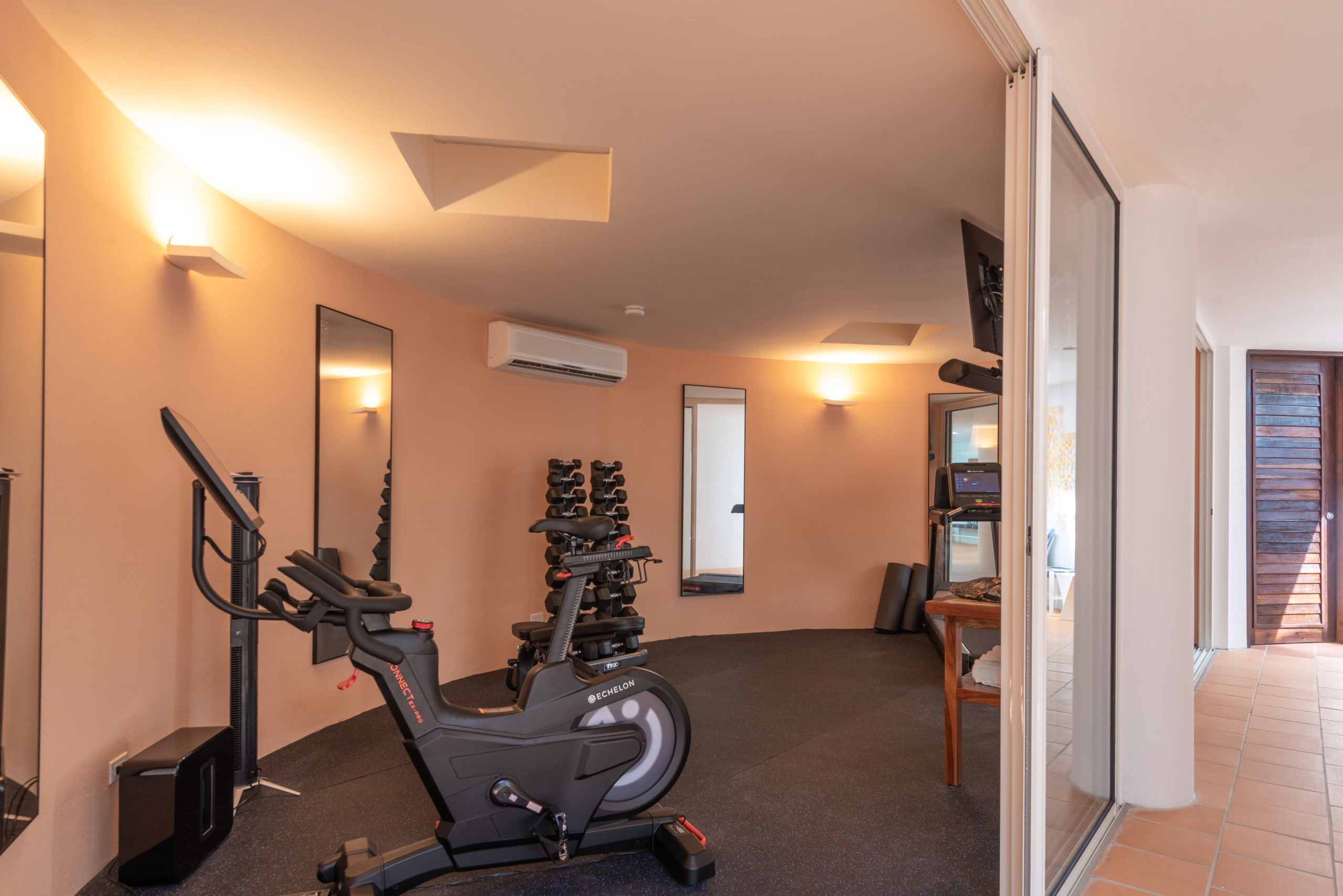 Upstairs, a fully stocked entertainment room beckons with a pool table, card tables, ping pong, and meditation space, all complemented by breathtaking ocean views. The third floor hosts a private fitness center equipped with free weights, yoga mats, a treadmill, and a spin bike, ensuring wellness and vitality during your stay.