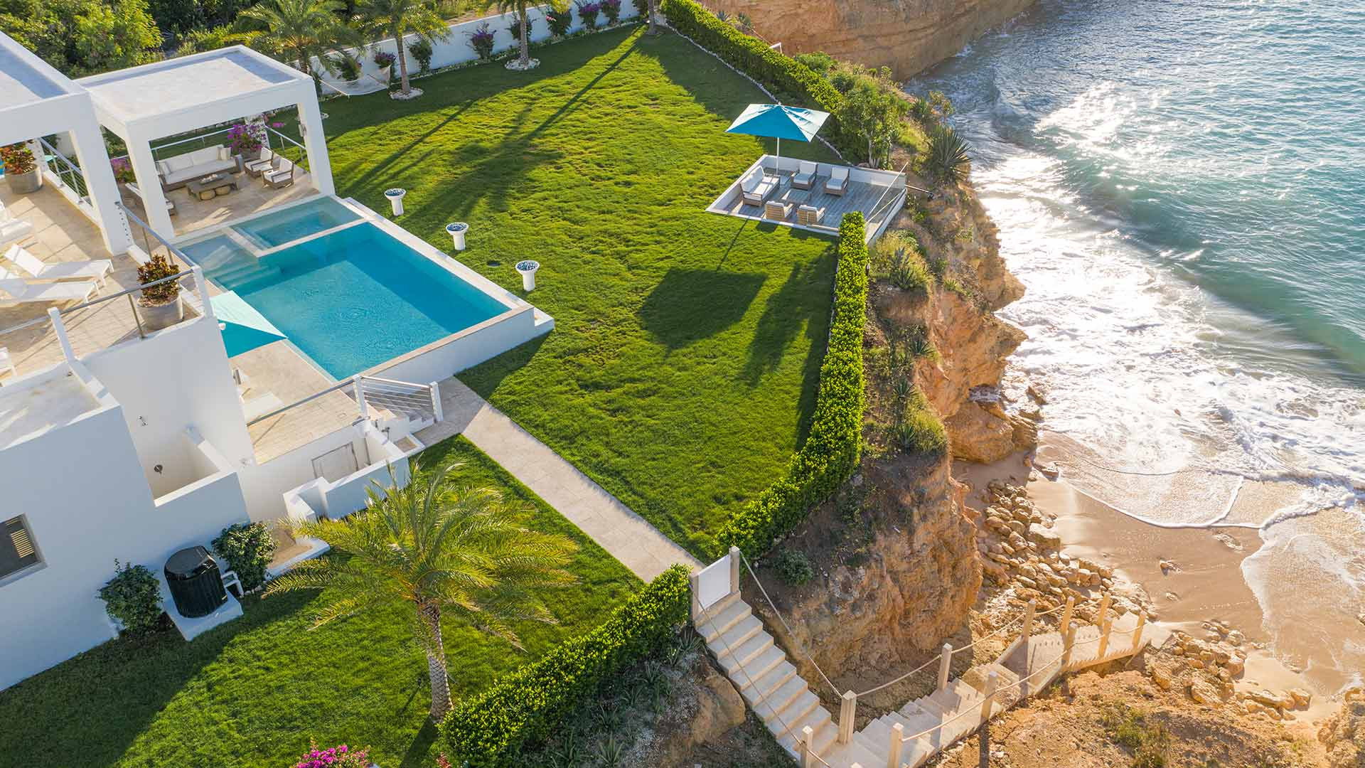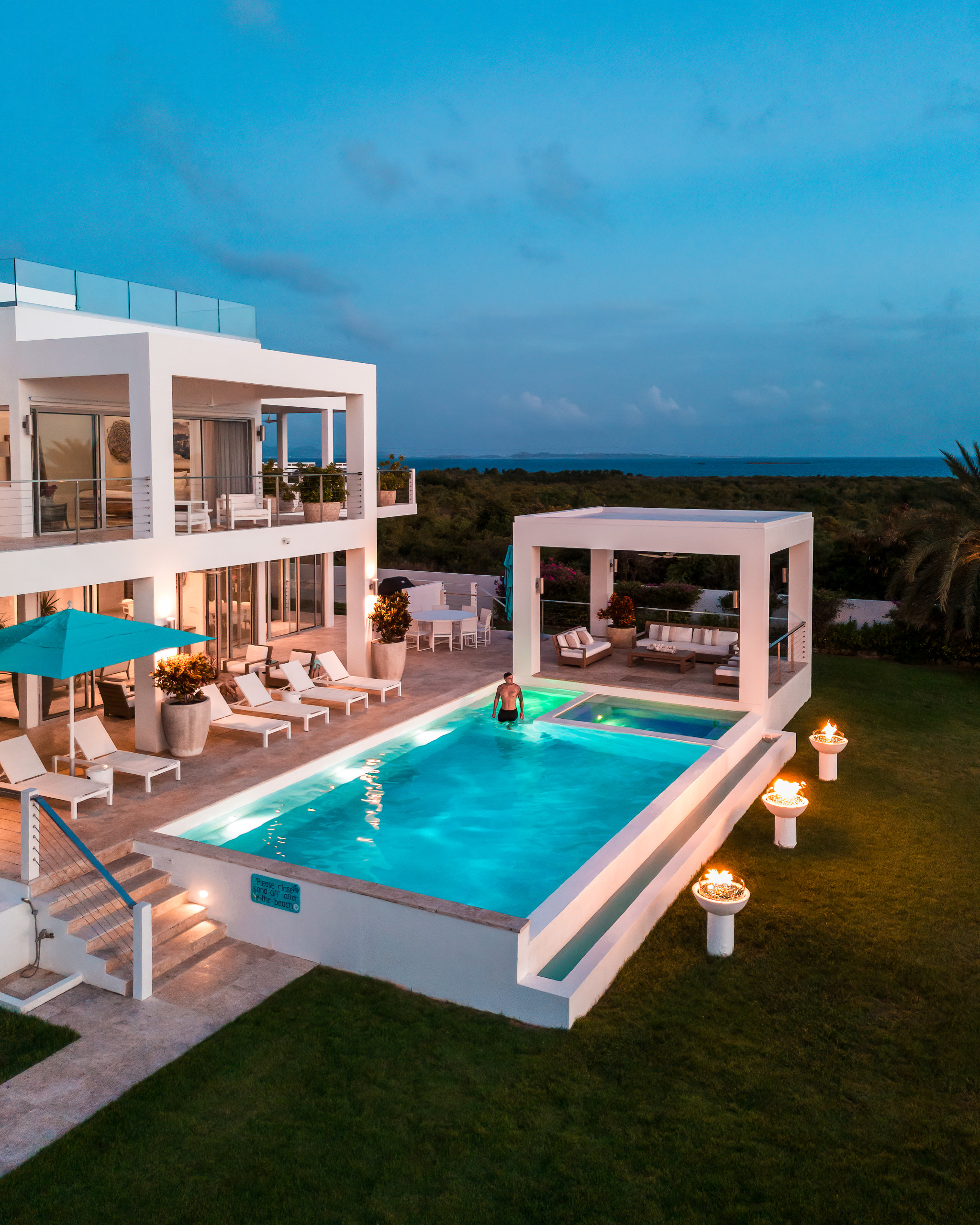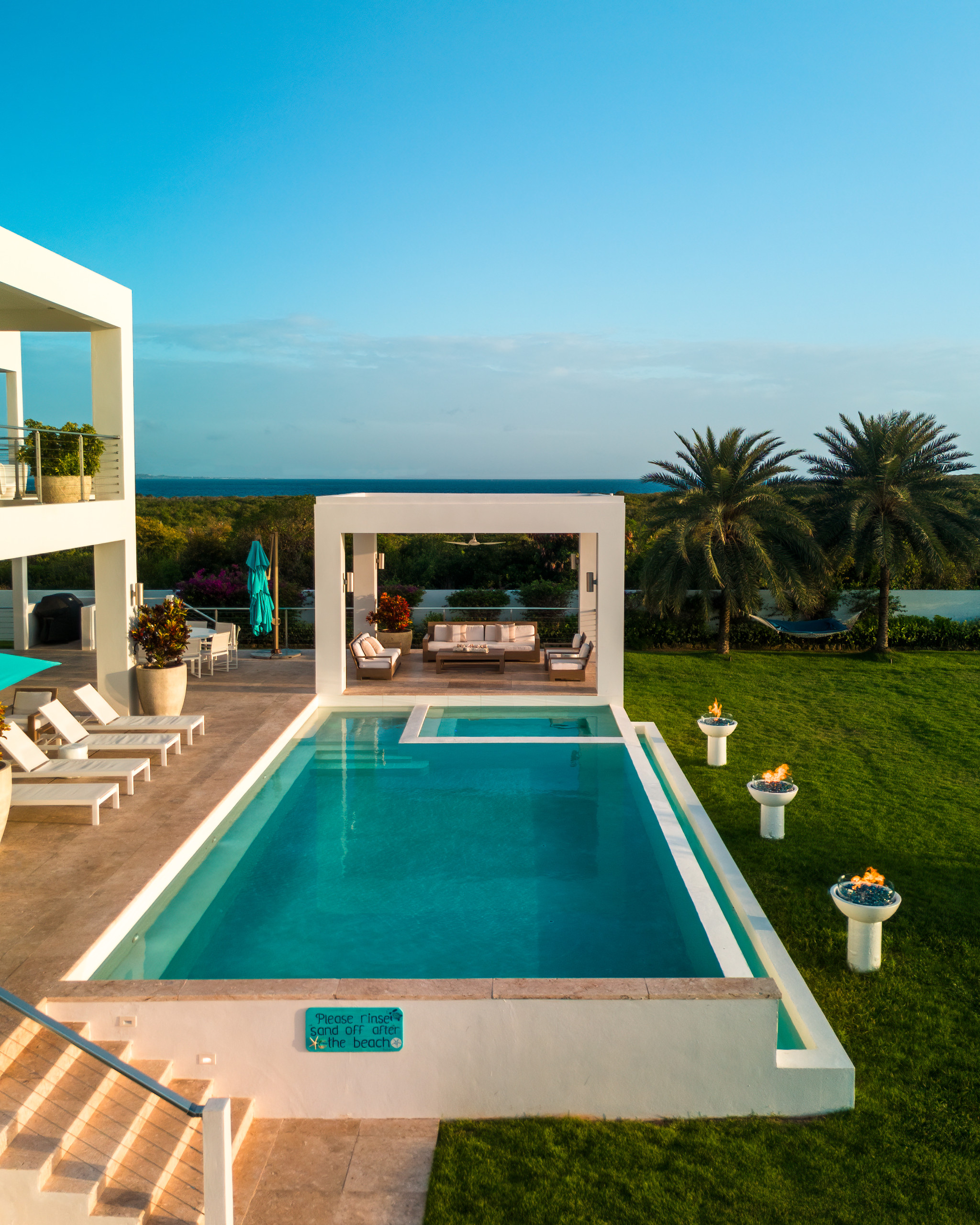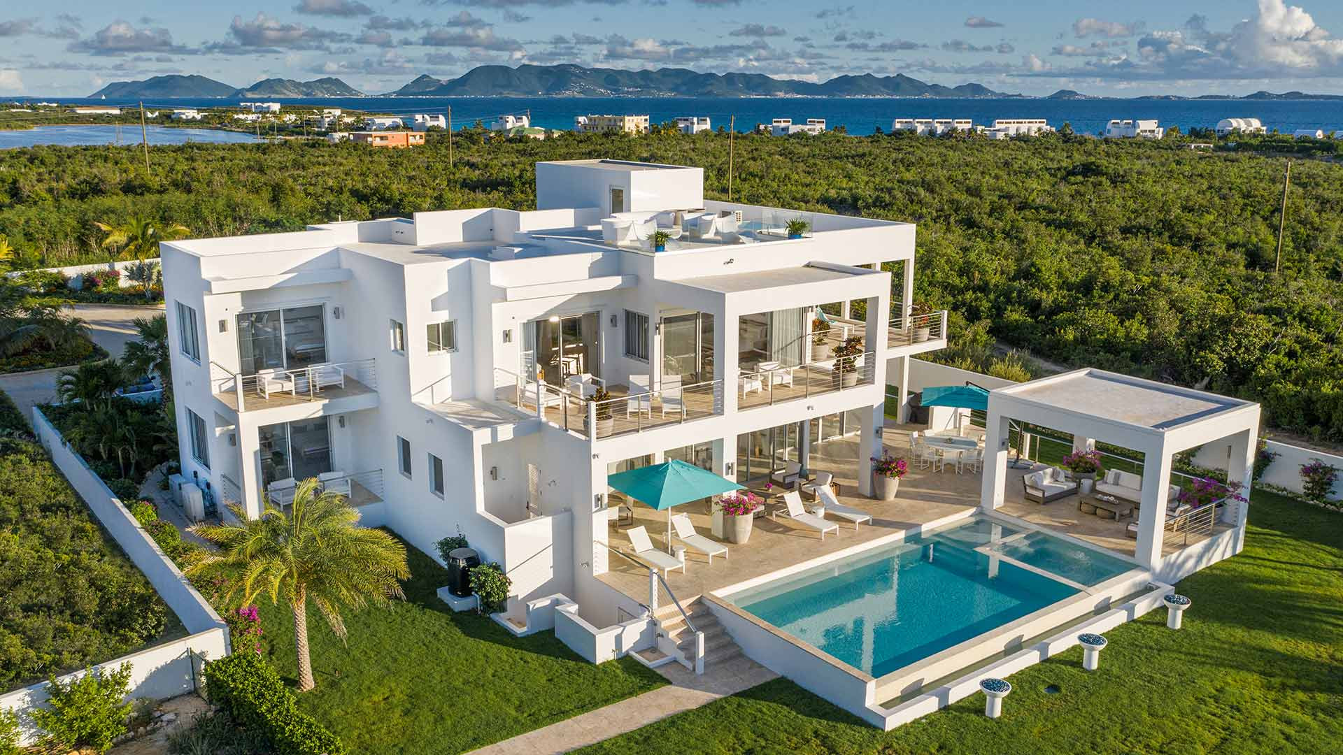 Perched atop the dramatic cliffs of West End, Kandara is an extraordinary eight-bedroom luxury villa that perfectly captures the beauty and serenity of Anguilla. Spanning over 10,000 square feet, the villa offers sweeping Caribbean views, exceptional privacy, and the ultimate blend of contemporary design with Caribbean charm. Floor-to-ceiling doors, expansive terraces, and multiple balconies allow natural light and ocean breezes to flow throughout, creating a seamless connection between the indoor and outdoor living spaces. The villa’s cliffside outdoor living room and elevated terraces provide panoramic vistas of the turquoise waters below, while a heated infinity pool, Jacuzzi, and sun-drenched lounging areas create the ideal setting for relaxation and entertaining.
