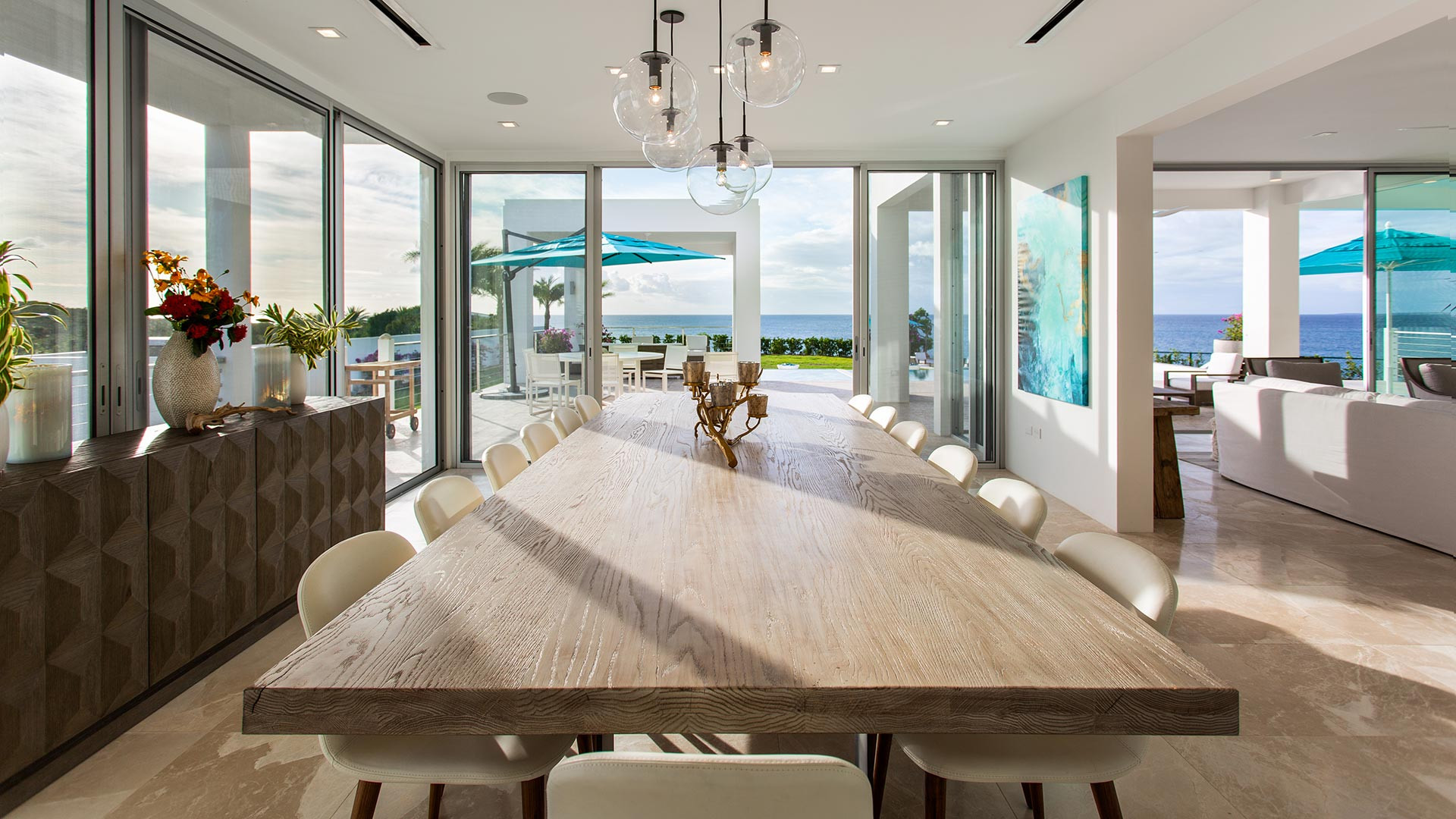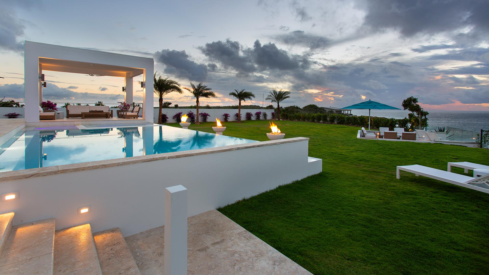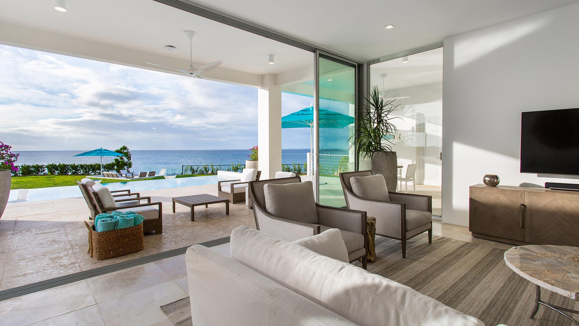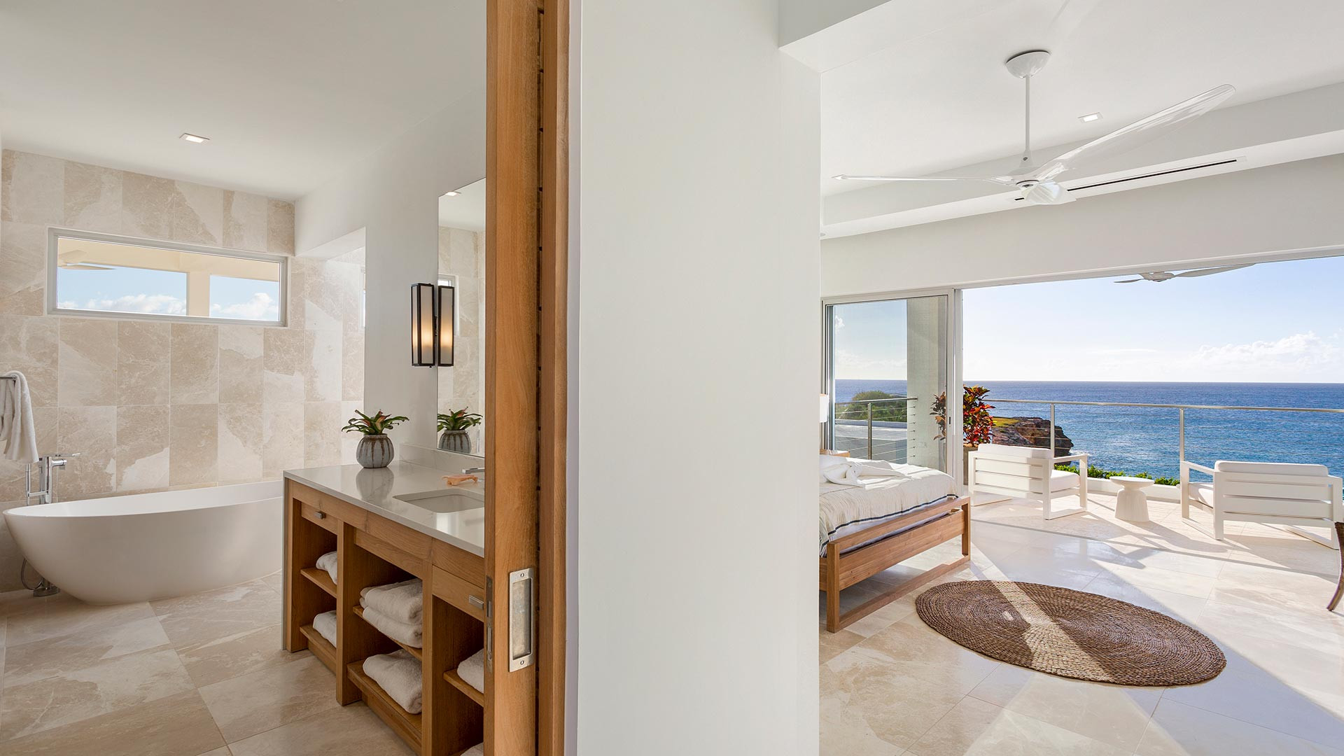 The villa’s interior spaces are as impressive as its surroundings. A spacious, open-plan living room flows effortlessly into the formal dining area and fully equipped chef’s kitchen, creating an environment designed for both relaxation and elegant entertaining. Floor-to-ceiling glass doors open onto alfresco dining pavilions and terraces, where guests can enjoy the gentle island breeze and dramatic sunsets over the Caribbean Sea. Multiple outdoor seating areas shaded lounging zones, and a cliffside dining area ensure that every meal and moment spent outside is accompanied by breathtaking views.